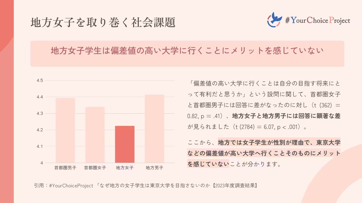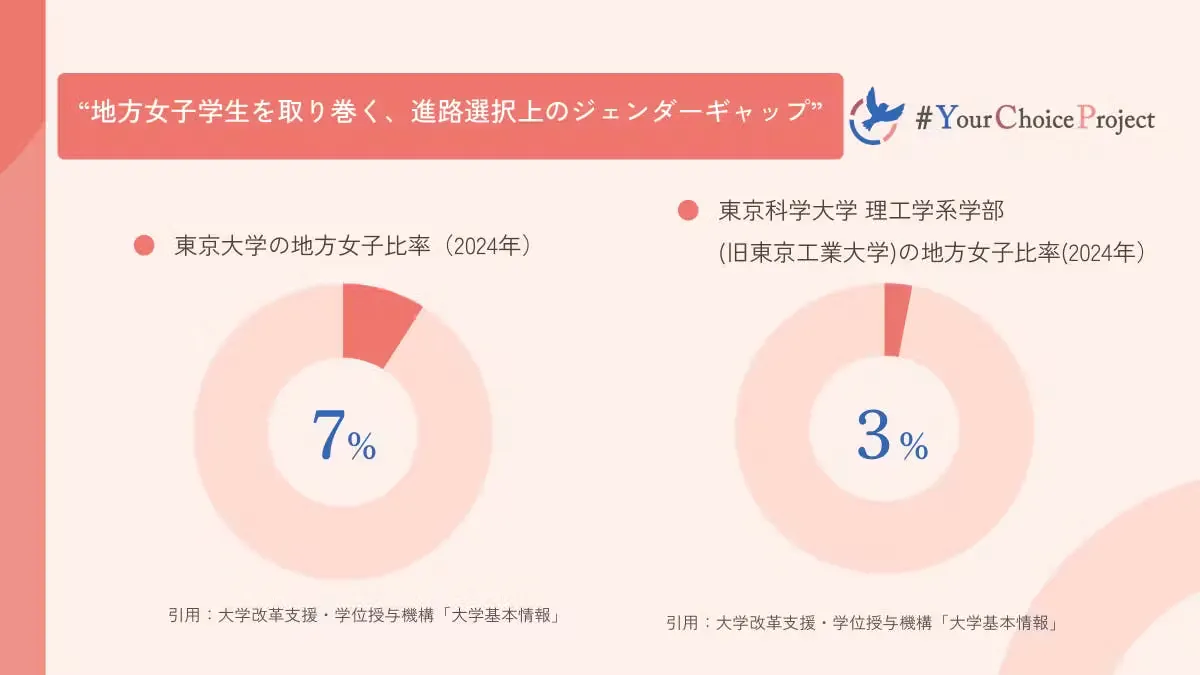 しかし、まだまだ私たちの目標である自由な進路選択が保証された社会は実現していません。今でも東大における女子学生の比率は2割程度にとどまったままで、その中でも地方女子の比率は8%です。今も地方では女子であることを理由に首都圏への進学を断念する学生がいるのです。