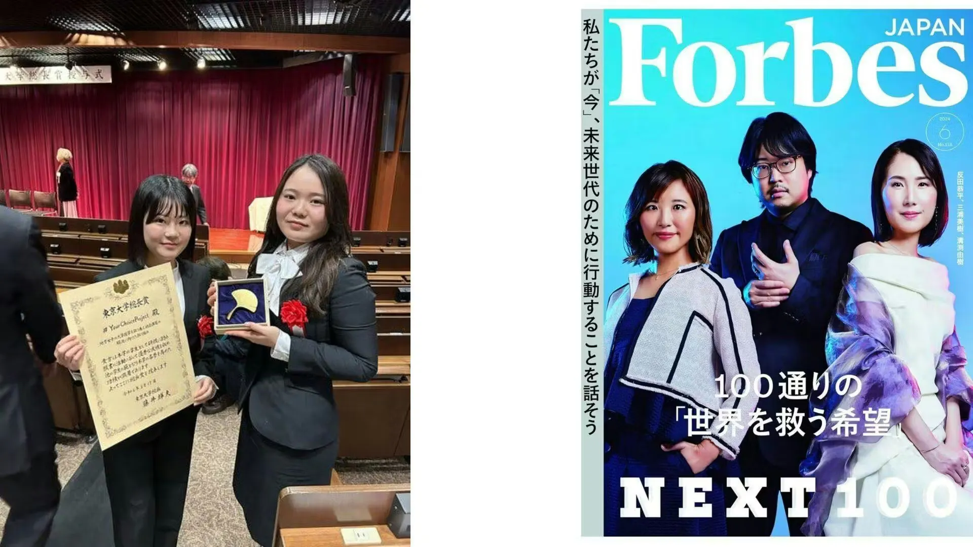 東京大学総長賞受賞の際の写真(左)と「今注目すべき『世界を救う希望』100人」に選出された際のForbesの表紙(右)