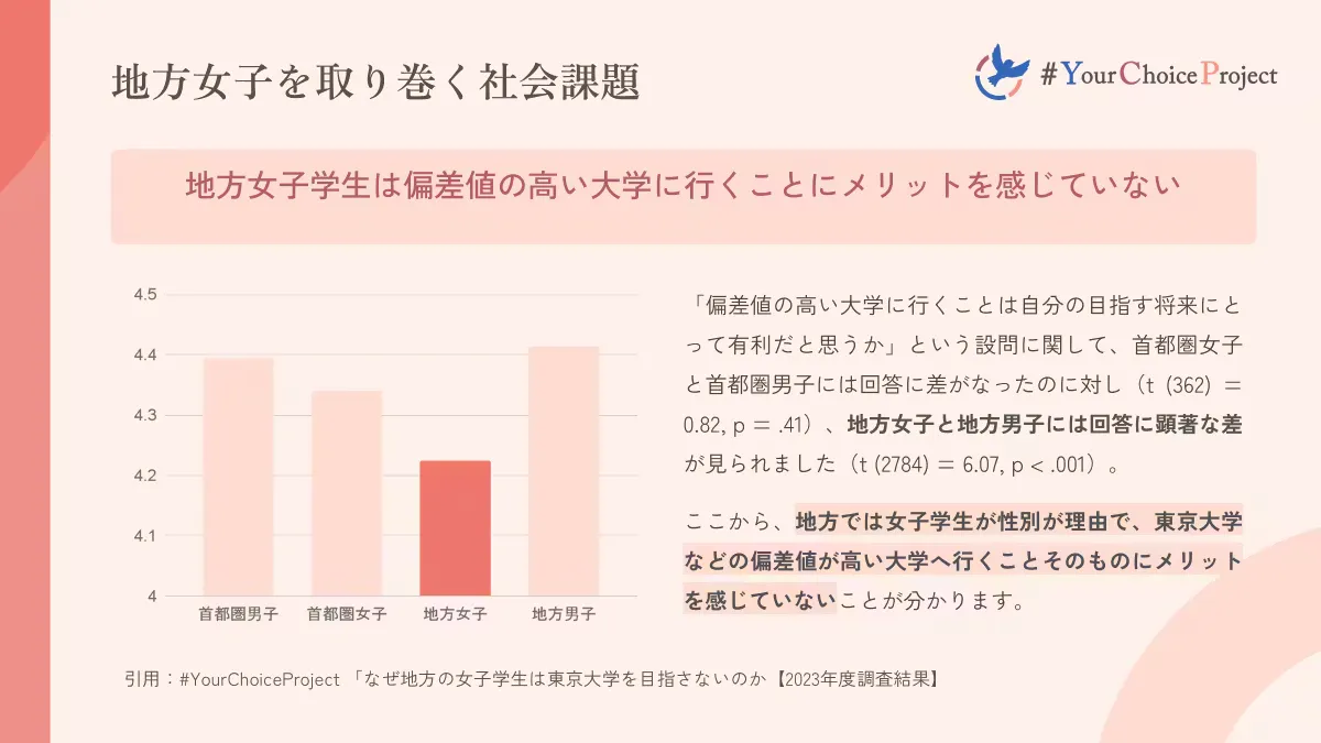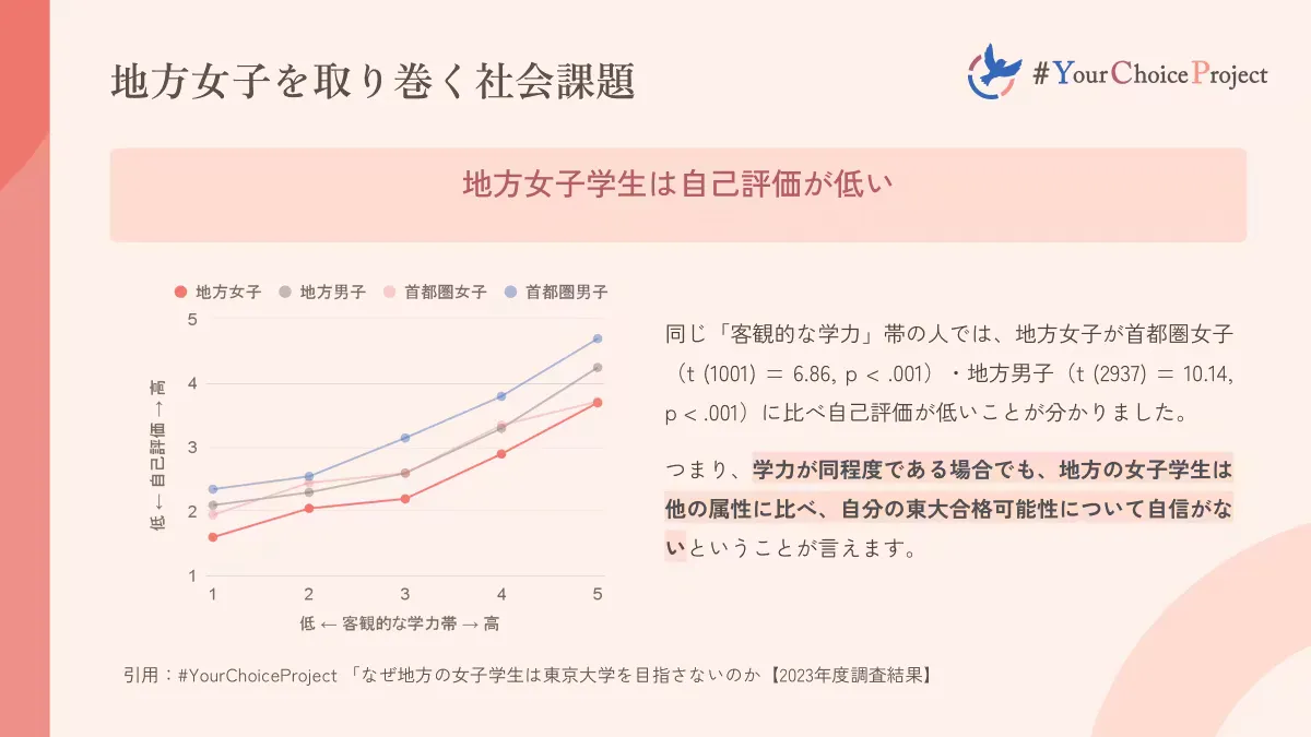 同程度の成績でも地方女子ほど自己評価が低く、自分が都心部の難関大学に受かるという自信がないことがわかりました。これも、先ほどの「女の子は地元に」という圧力の副産物であると考えられ、「自分には無理だ」と自らの可能性を狭めてしまう地方女子が多くいるのです。
