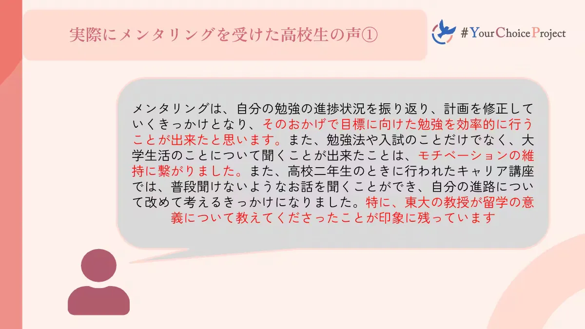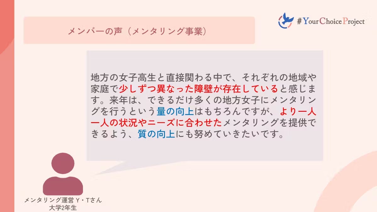 #YCPはこれまで総勢100名以上にメンタリングを届けており、この春には一期生が卒業しました。彼女たちに対して行った効果測定では、学習モチベーションの向上や、進路選択の視野の広がりが実証されました。また、卒業した一期生の中には、今度はメンタリングを提供する側として#YCPの活動に協力してくれている人もいます。