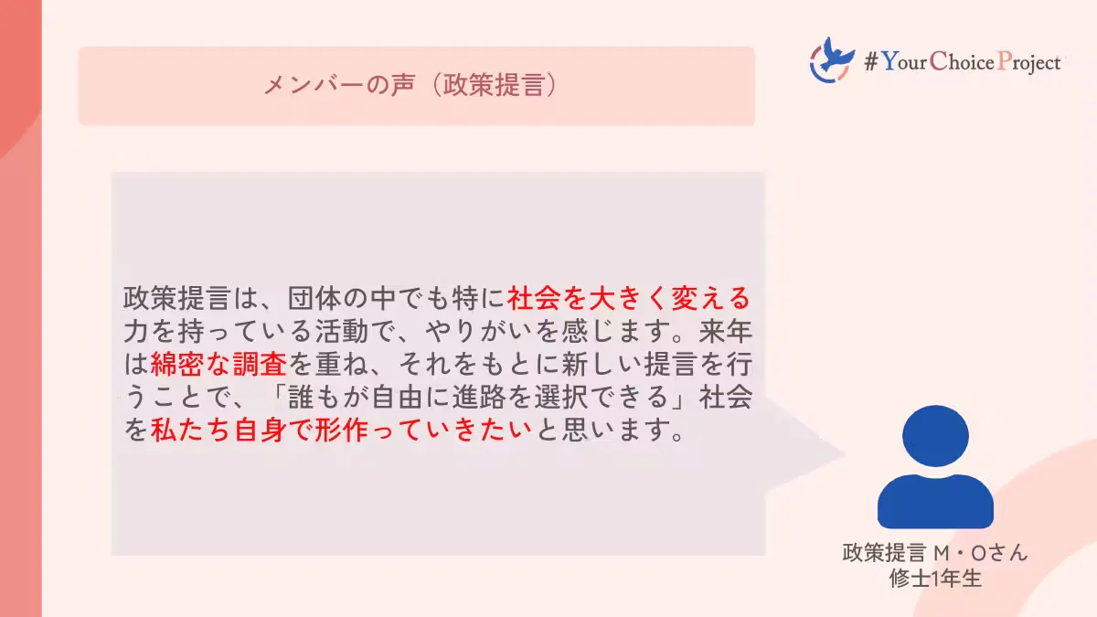 この2年間で私たちの課題意識が多くの人に共有され、共感してくださる方も増えてきました。その一方で批判を受けることも多くなり、非常に苦しい思いをした時もありました。それを乗り越え、ここまで活動してこられたのは、ひとえに応援してくださる皆様のおかげです。これからも私たち#YCPは「誰もが自由に自分の将来を決めることができる社会」の実現のために全力で活動していきます。