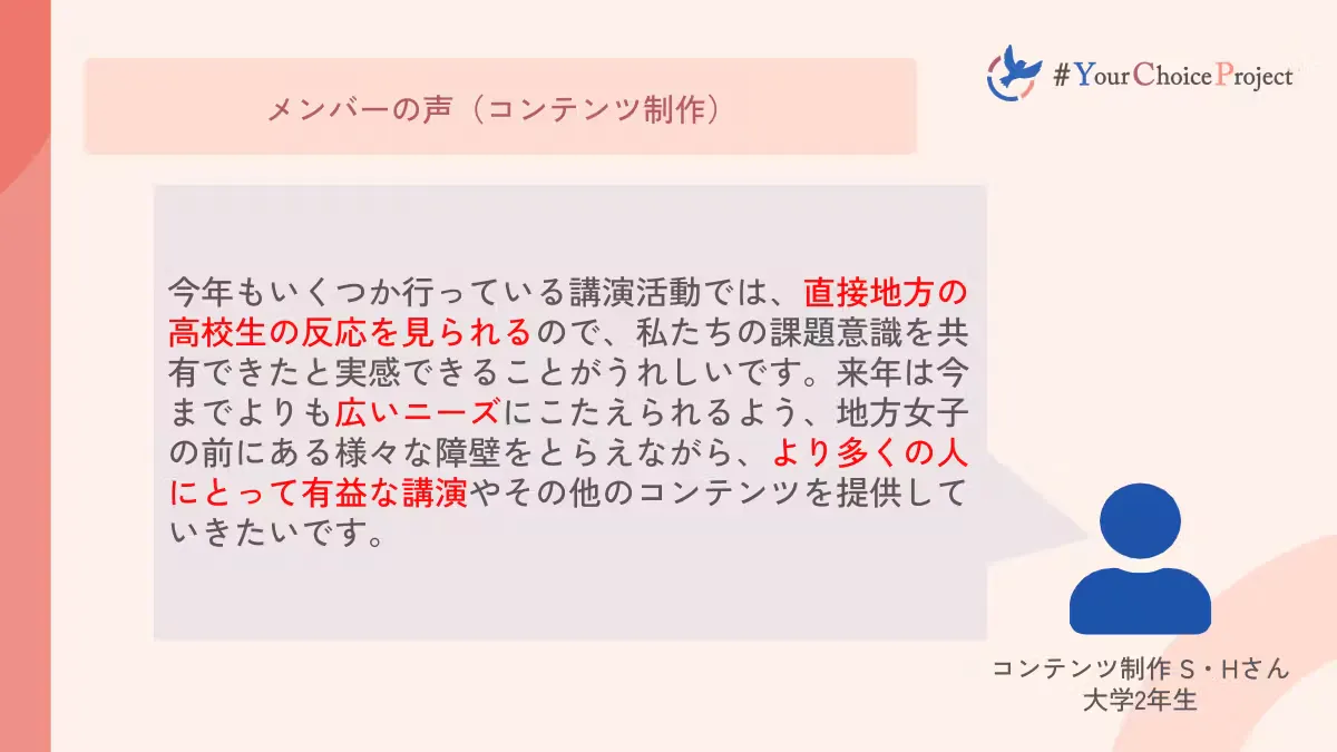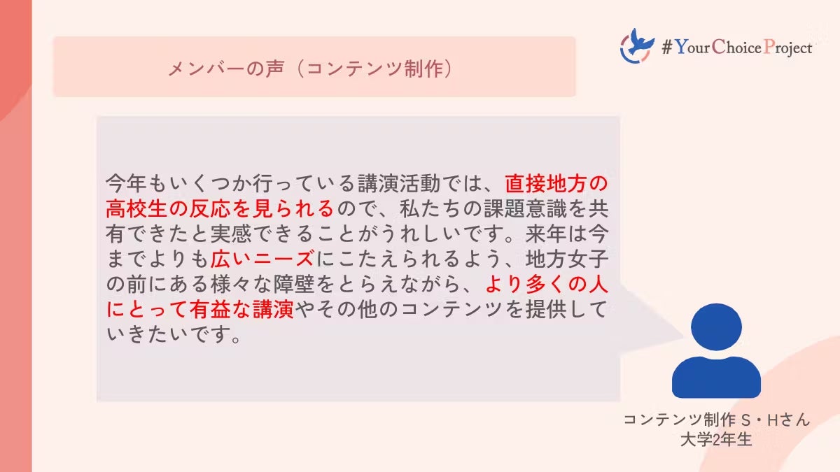 学校や保護者の方に向けてのコンテンツの充実にも力を入れて参ります。思っている以上に様々な選択肢があることやジェンダーバイアスが気づかずに可能性を狭めてしまうことについて知ってもらうことで、地方の高校生や周囲の方の意識を変えていきたいと思っています。今年度も複数の高校で講演会を実施しており、来年はさらに訪問校を増やしていきたいと考えています。