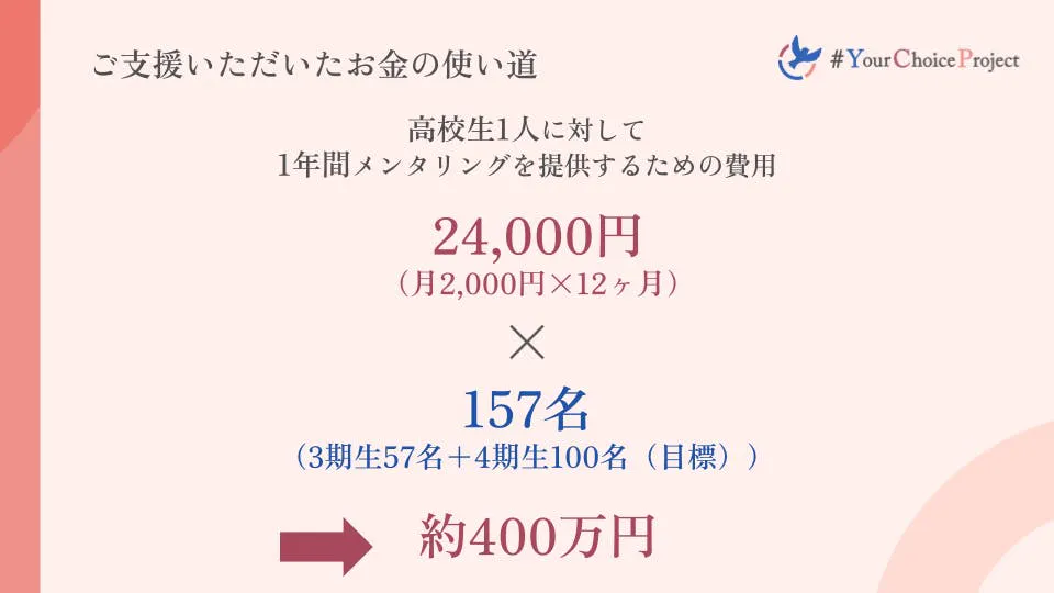 団体設立から2年目の2023年に私たちが行ったクラウドファンディングでは、300名近い皆様の温かいご支援のおかげで、400万円を超える寄付が集まりました。また、前回のクラウドファンディングをきっかけに#YCPを知っていただいた方も多く、この2年間の飛躍の大きなきっかけになりました。この寄付金はメンタリング事業、調査事業などを行う際に、非常に重要な資金となりました。改めて、温かいご支援ありがとうございました!