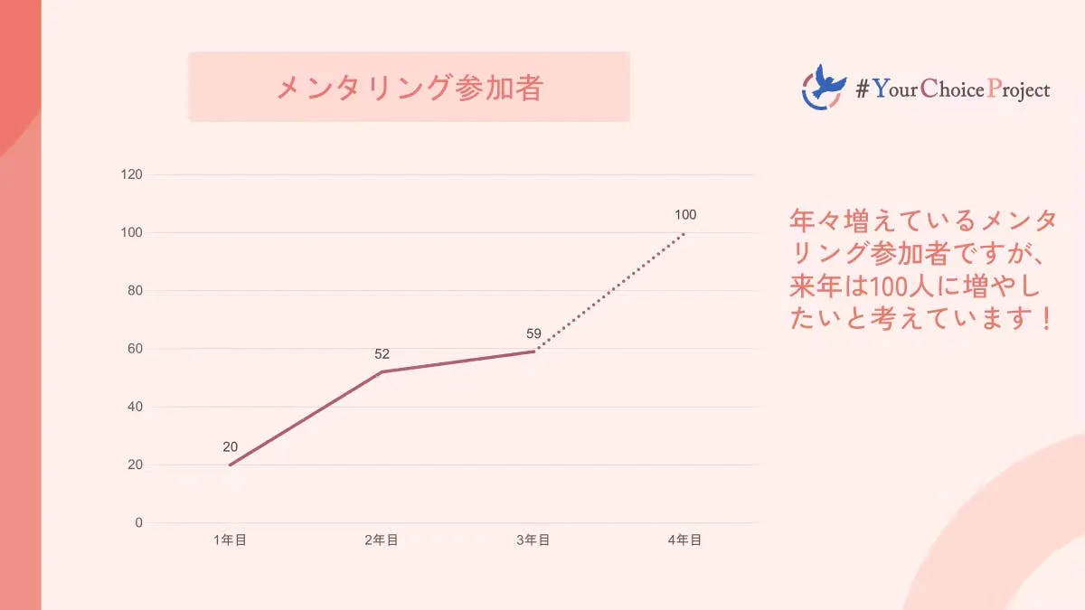 私たちはこのメンタリング事業を強化し、来年には年間100名の地方女子高校生へメンタリングを実施したいと考えています。