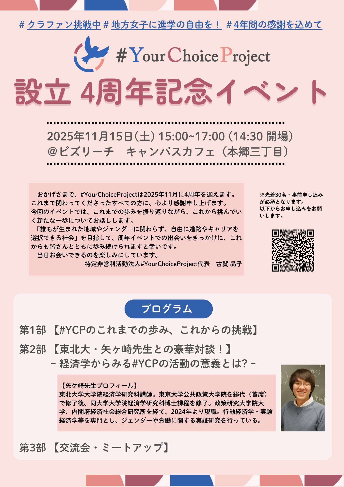 2025/11/16 20:27設立4周年記念イベントを開催しました!15日に#YCPの設立4周年を記念してイベントを開催しました! お集まりいただいた皆様本当にありがとうございました。今回の周年イベントでは、代表の古賀からこれまでの活動とこれからの発展についての話や、現在共同で事業を行っている東北大学の矢ヶ崎先生との対談を行いました。また、参加者の皆様と団体のメンバーが交流する時間では、#YCPのメンバーたちの思いを知っていただくとともに、参加者の皆様からのご意見を伺うこともでき、大変充実した時間でした!これからも#YCPは地方女子が自由に進路を選択できる未来を目指して活動していきます。引き続きご支援・ご協力よろしくお願いします。 もっと見る