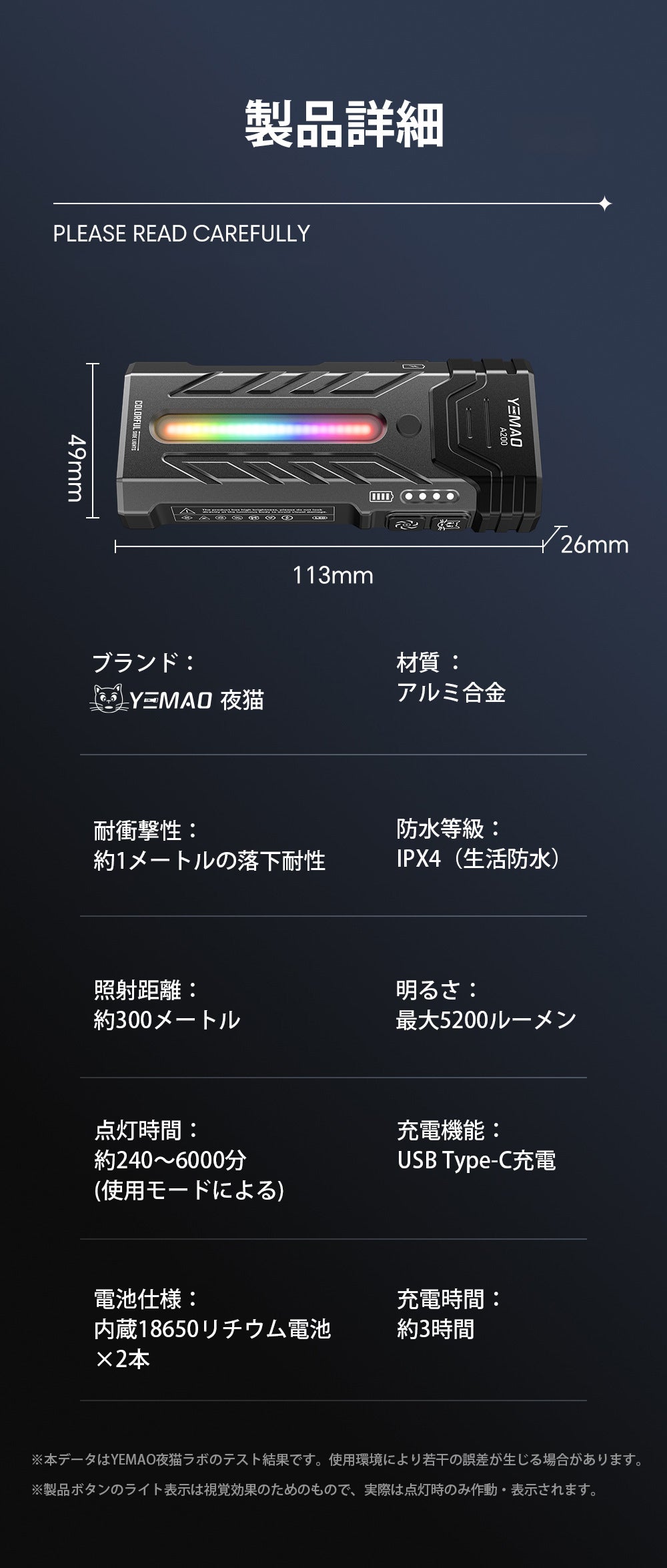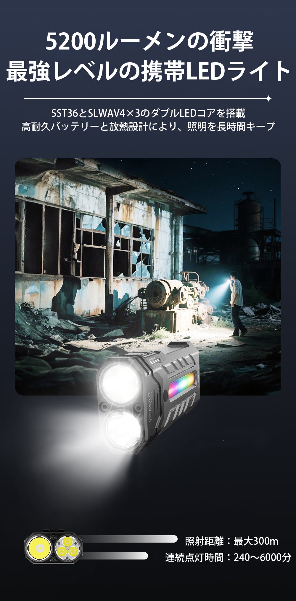 本製品は最大5200ルーメンの超高輝度照明に対応しており、暗闇を昼のように照らし出せるため、視界が確保できず不安になることはもうありません。