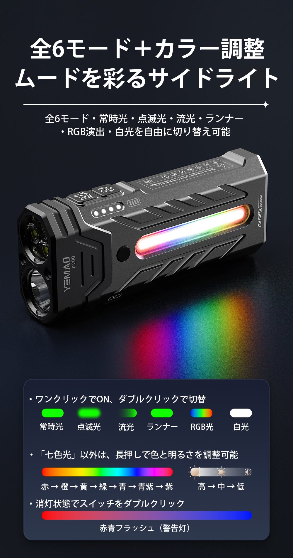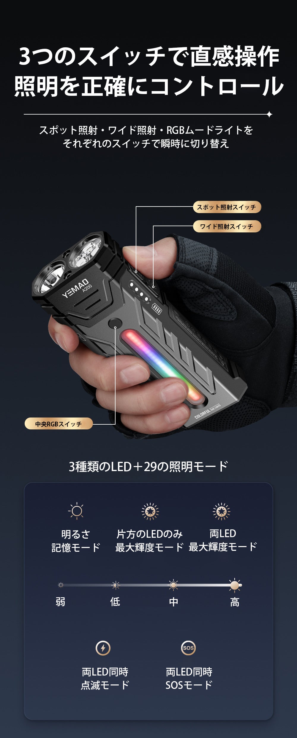 3つのスイッチがそれぞれ異なるライトを担当する独立設計のため、ボタンを探して迷うことなく直感的に操作でき、必要な光をすぐに点灯できるので、暗闇での煩わしい操作ミスに悩まされることはなくなります。