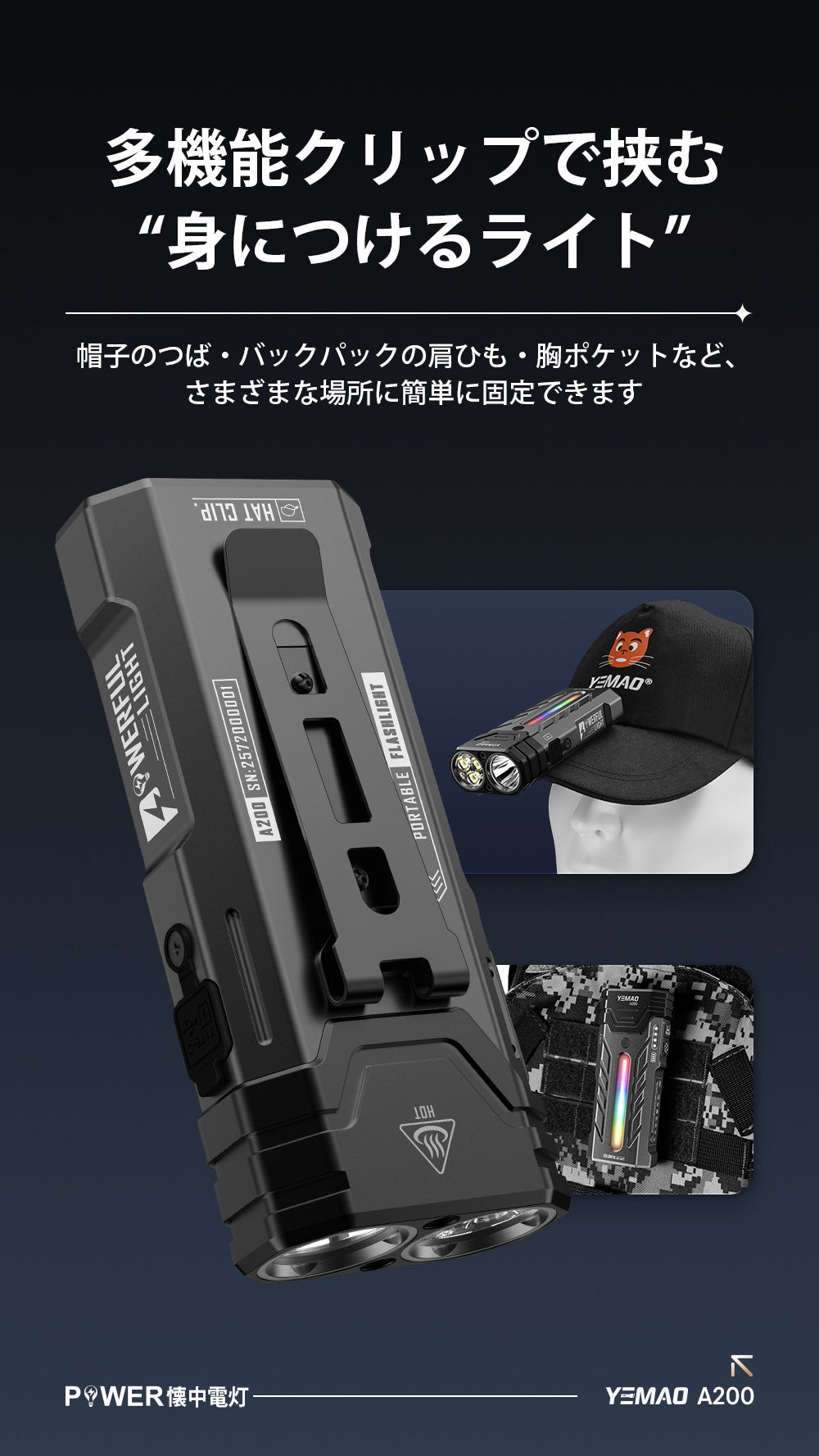 多機能クリップを搭載しているため、帽子のつばやバッグのストラップなどに簡単に挟むことができ、移動中や作業中でもライトを安定した位置に固定できます。