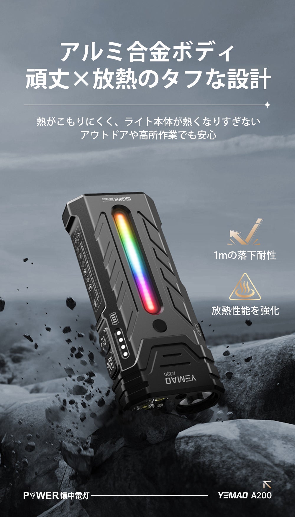 高強度なアルミ合金ボディを採用しているため、軽量でありながら優れた耐衝撃性と耐久性を兼ね備え、アウトドアや作業現場など過酷な環境でも安心して使用できます。