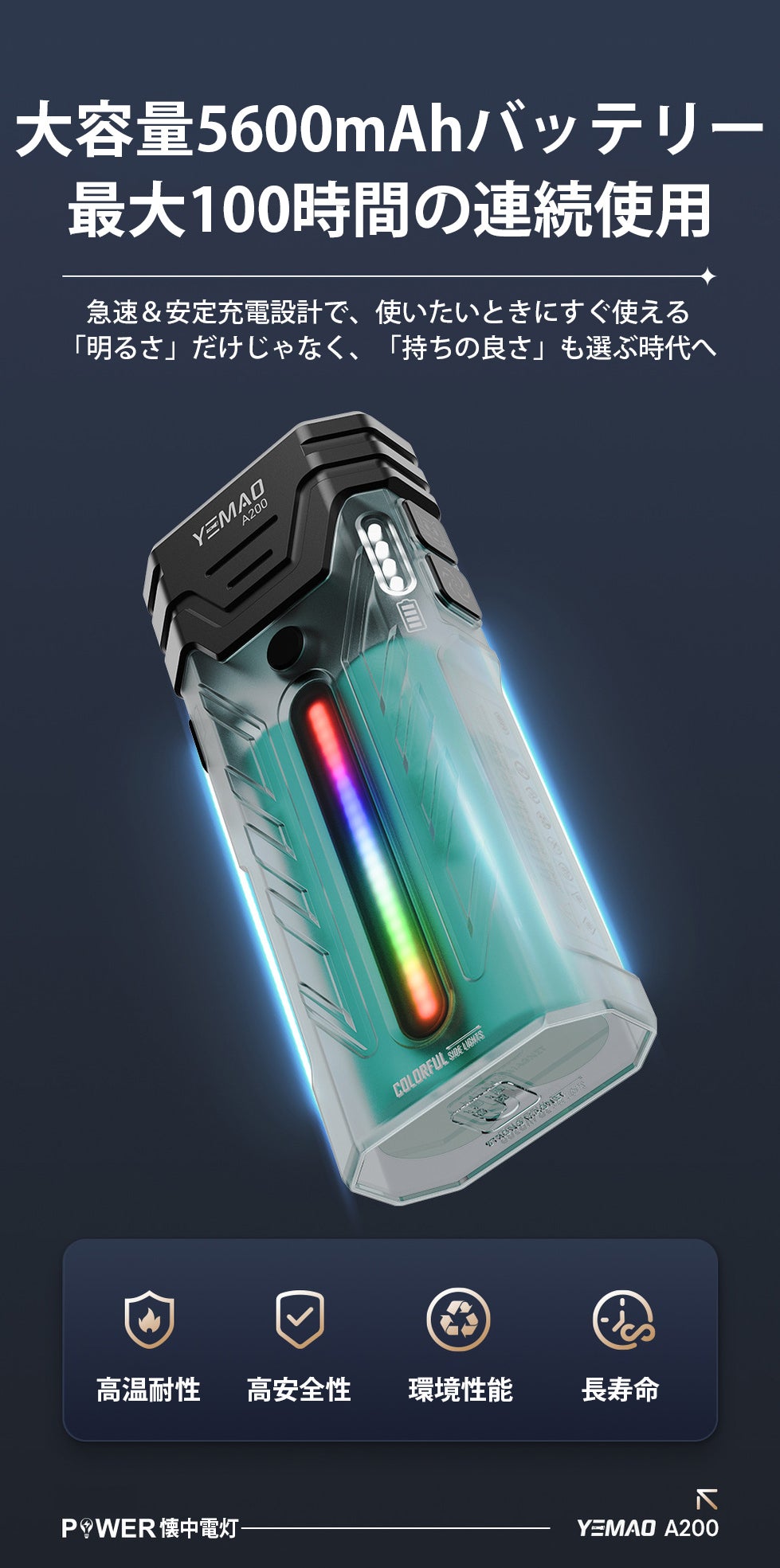 合計5600mAhの大容量バッテリーを搭載しているため、明るさを保ったまま長時間使用でき、キャンプや夜間作業、防災用としても安心の電力持続を実現します。
