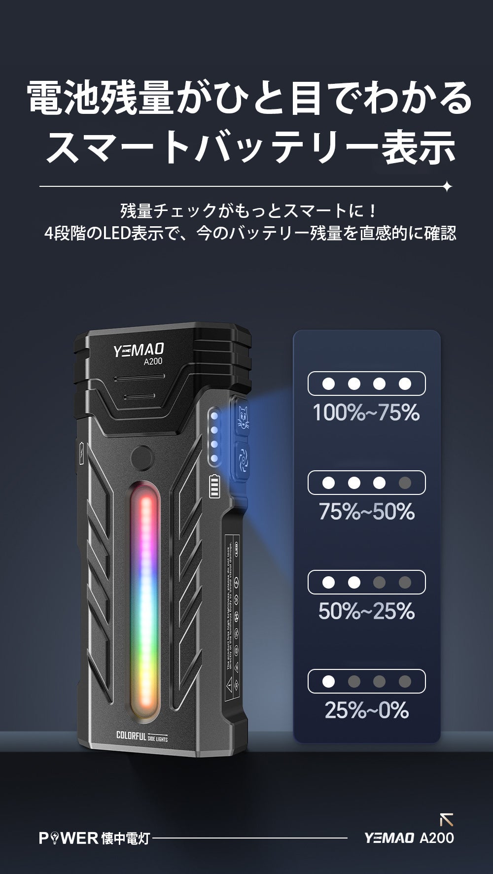 本体側面にスマートバッテリーインジケーターを搭載しているため、バッテリー残量をひと目で確認でき、突然の電池切れを防いで計画的に使用できます。