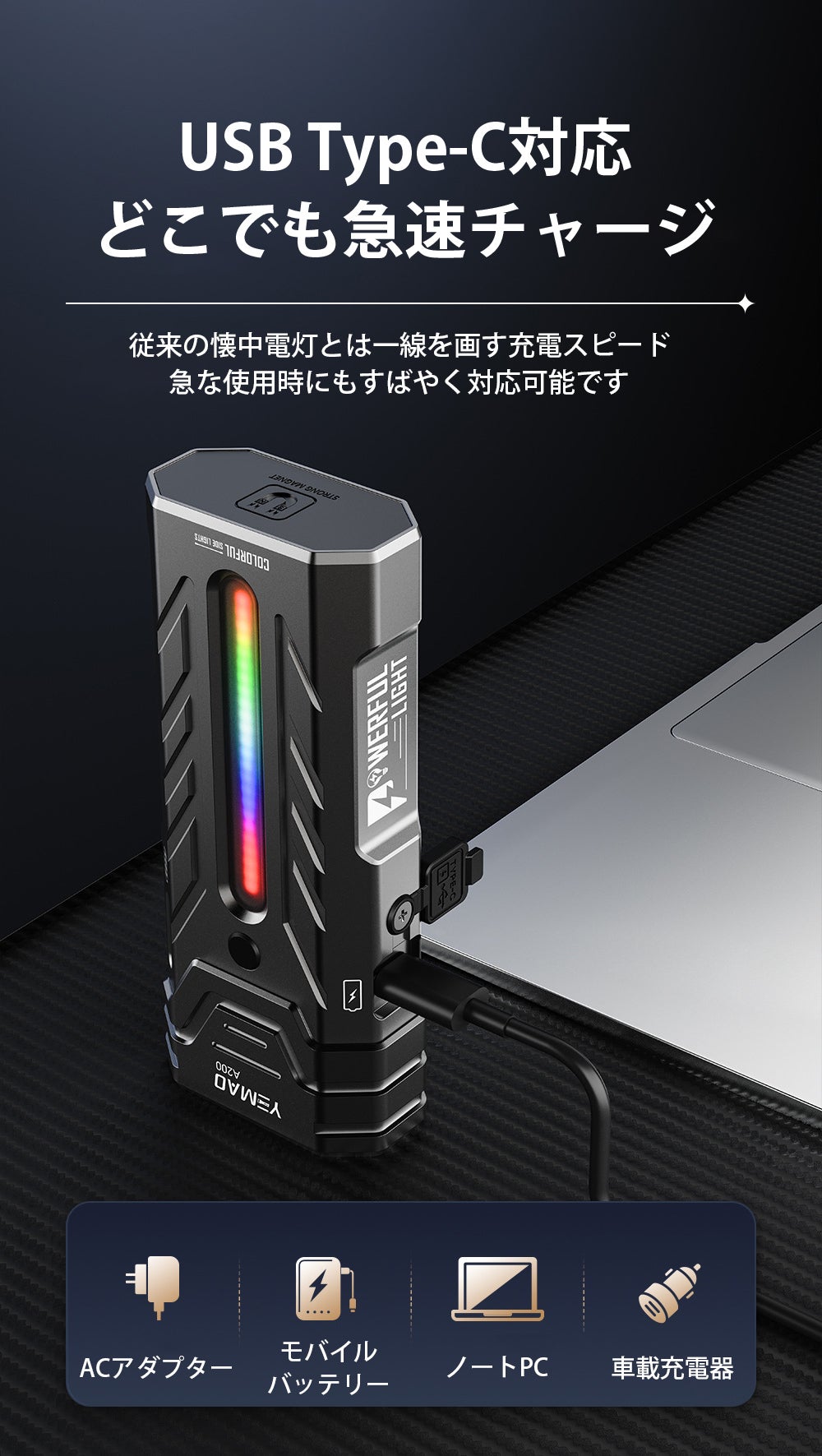 USB Type-Cポートによる充電に対応しているため、モバイルバッテリーやPCなどからも手軽に給電でき、外出先や緊急時でもスムーズに充電が行えます。