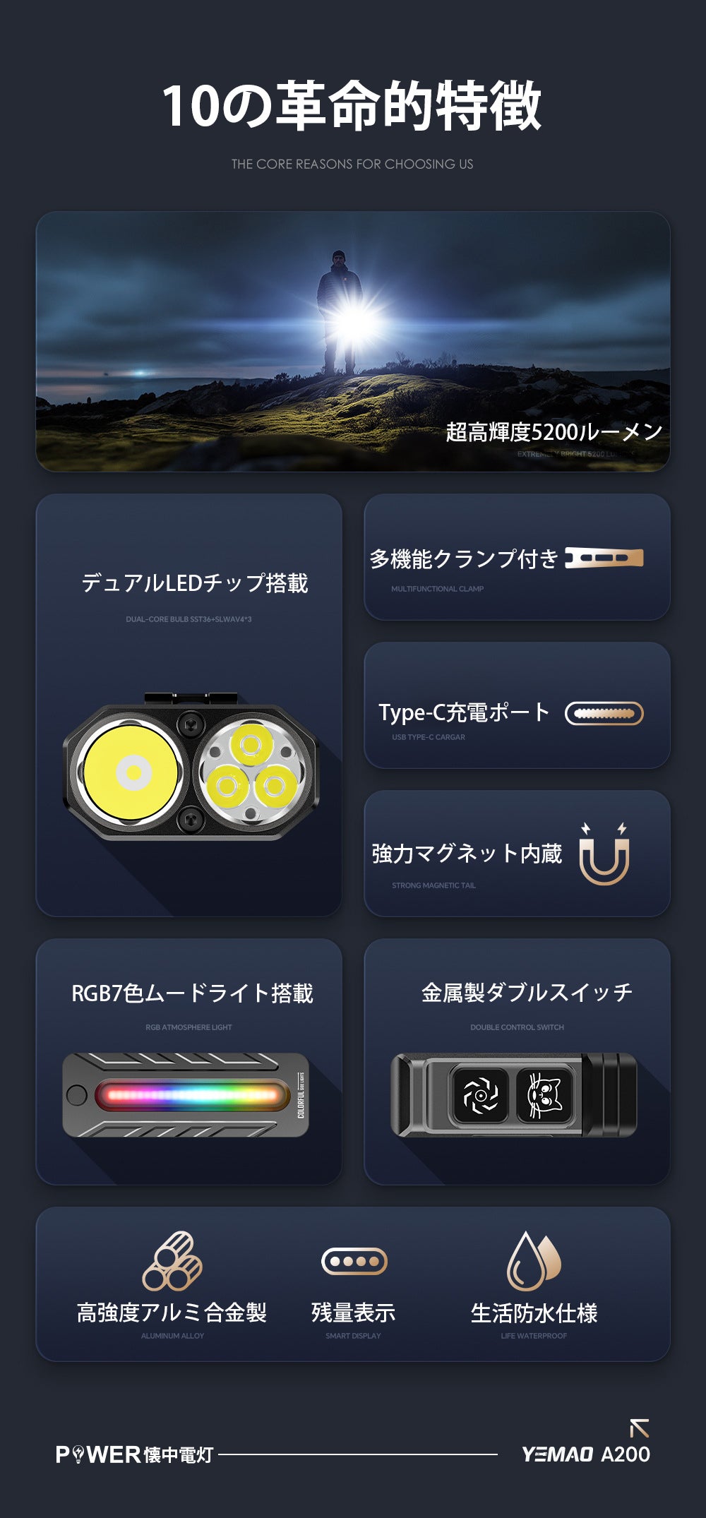 高強度なアルミ合金ボディを採用しているため、軽量でありながら優れた耐衝撃性と耐久性を兼ね備え、アウトドアや作業現場など過酷な環境でも安心して使用できます。