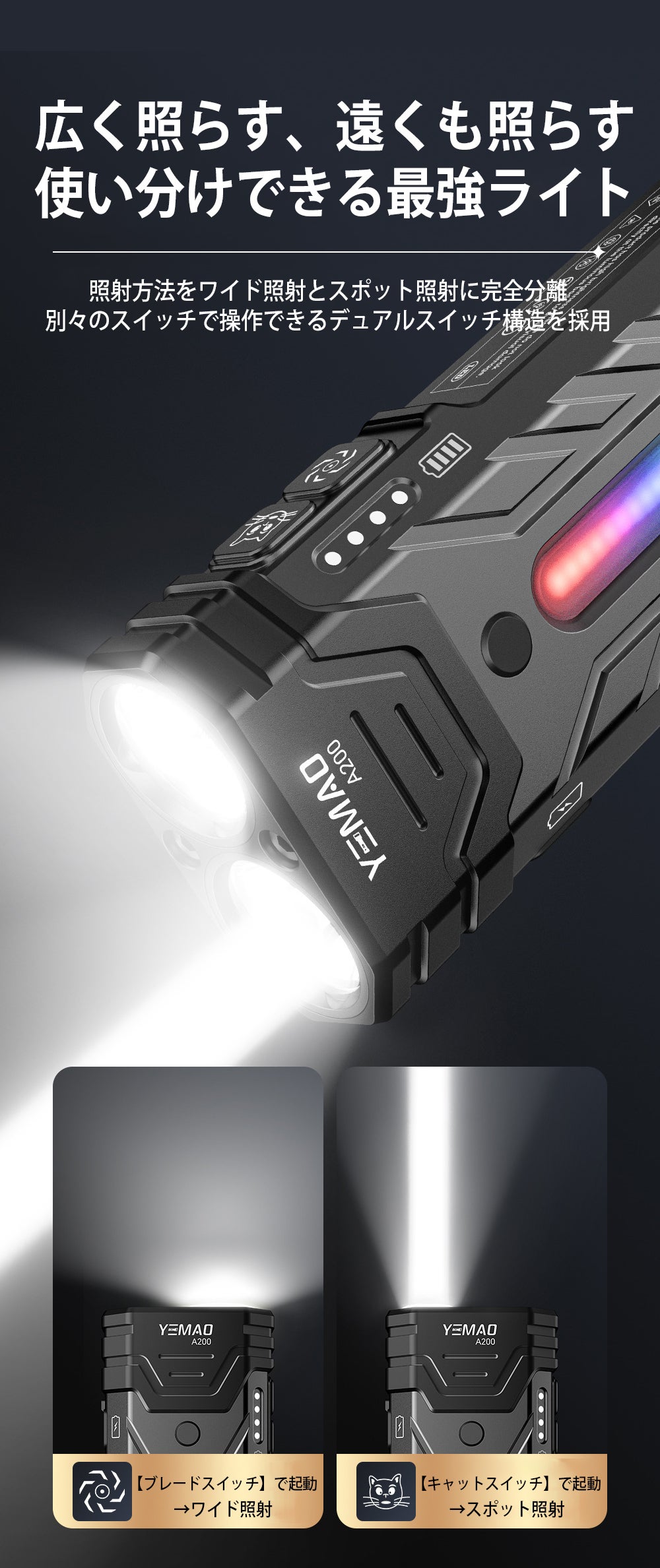 遠近切り替えが可能な独立スイッチ設計により、手元の作業には広範囲を照らすワイド照射、遠距離の確認には強力な集光のスポット照射を瞬時に切り替えられるため、シーンに応じて照射モードに迷うことはなくなります。