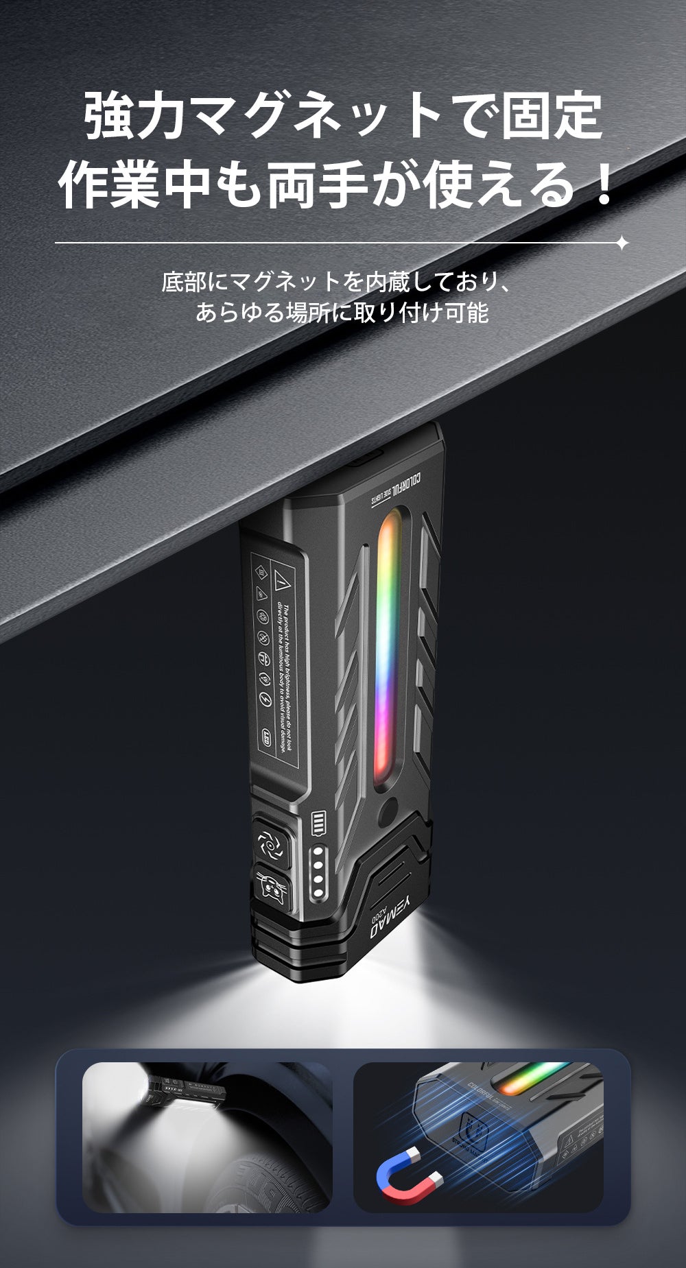 底部に内蔵された強力マグネットにより、金属面へしっかりと固定できるため、車の整備や屋外作業など両手を使いたい場面でも安定した照明を確保できます。