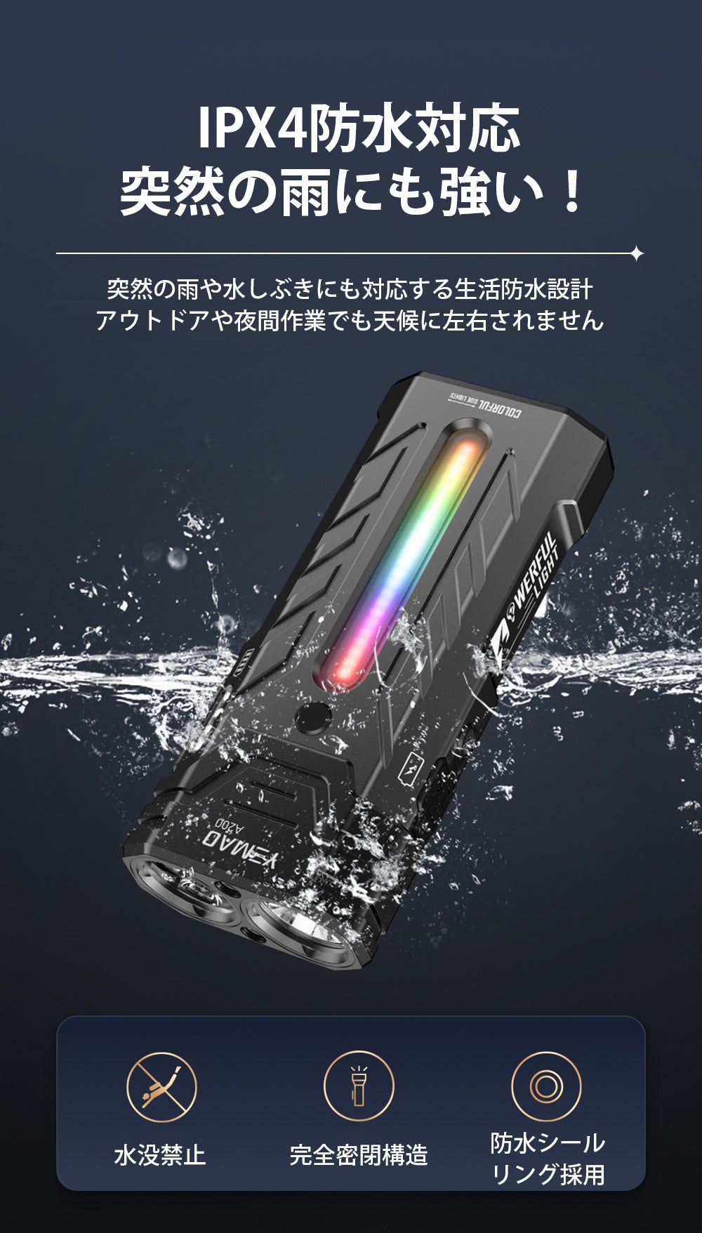 IPX4等級の防水性能により、突然の雨や水しぶきがかかる状況でも使用できるため、天候に左右されずに屋外作業やアウトドアで活用できます。