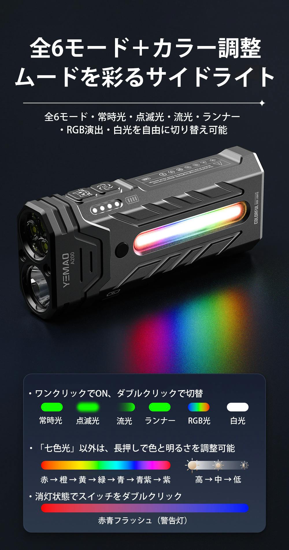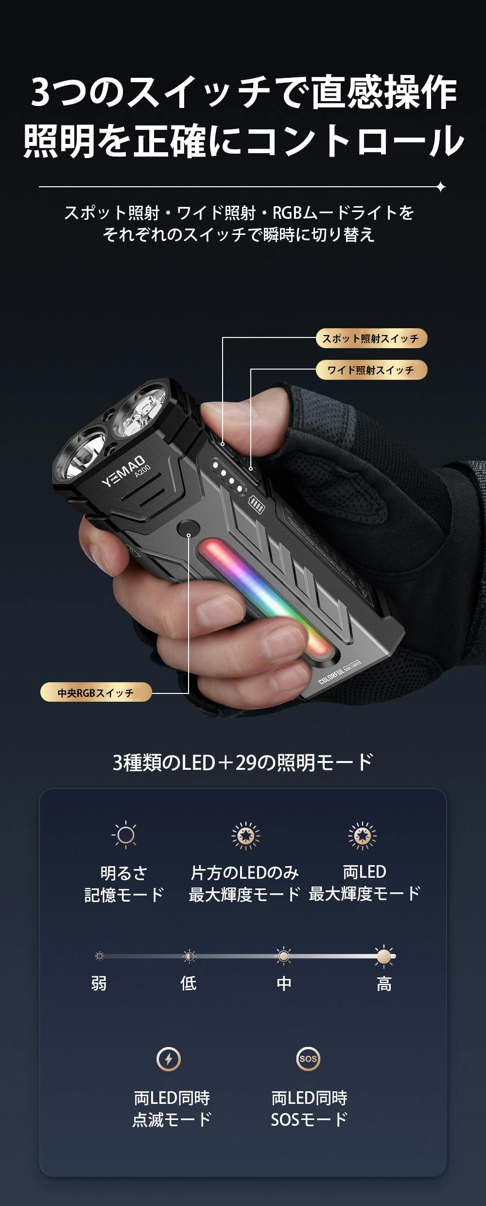 29種類の多彩な照射モードを搭載しているため、シーンや用途に応じて最適な明るさや点灯パターンを自由に選ぶことができ、作業、アウトドア、防災など幅広い状況で柔軟に対応できます。