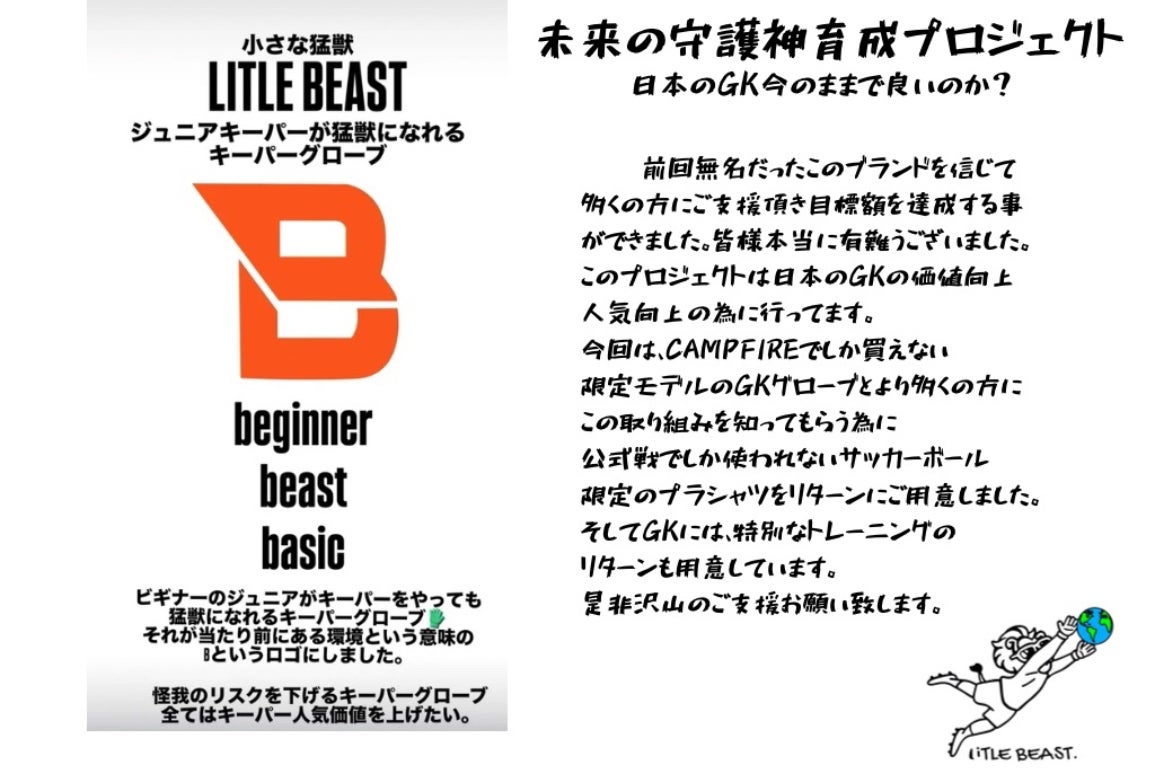 2025/10/11 12:56未来の守護神育成プロジェクト始動日本のゴールキーパーの価値向上を目指して、クラウドファンディングに挑戦しています。私は8歳のゴールキーパーの父親です。息子は6歳からGKを始め、これまで30種類以上のキーパーグローブを試してきました。その中で、日本にはジュニアサイズで安心して使える本格的なグローブがほとんどないことに気づき、今年3月に第1弾のクラウドファンディングを実施しました。結果、200件を超えるご注文をいただき、全国36都道府県にL1TLE BEASTのグローブが届きました。ご支援・ご声援、本当にありがとうございました。第2弾はGKだけでなくサッカーファミリーへ今回のプロジェクトでは、GKファミリーはもちろん、サッカーファミリーの皆さんにも楽しんでいただけるように、クラウドファンディング限定で以下のアイテムをご用意しています。・マッチボール・レガース(すね当て)・プラシャツ・ヘアバンドすべてL1TLE BEASTオリジナル仕様で、ここでしか手に入らない限定アイテムです。生産拠点は世界の工場「パキスタン・シアルコート」L1TLE BEASTの製品はすべて、パキスタン・シアルコートで製造しています。この街は、世界のキーパーグローブとサッカーボールの約7割を生産し、ヨーロッパをはじめ世界各国に出荷されています。リターンでご用意しているアイテムは、すべて世界基準の高品質な製品です。最後に日本のゴールキーパー文化をより豊かにし、子どもたちが誇りを持ってゴールを守れる未来をつくるために、ぜひご支援・ご拡散をよろしくお願いいたします。 もっと見る