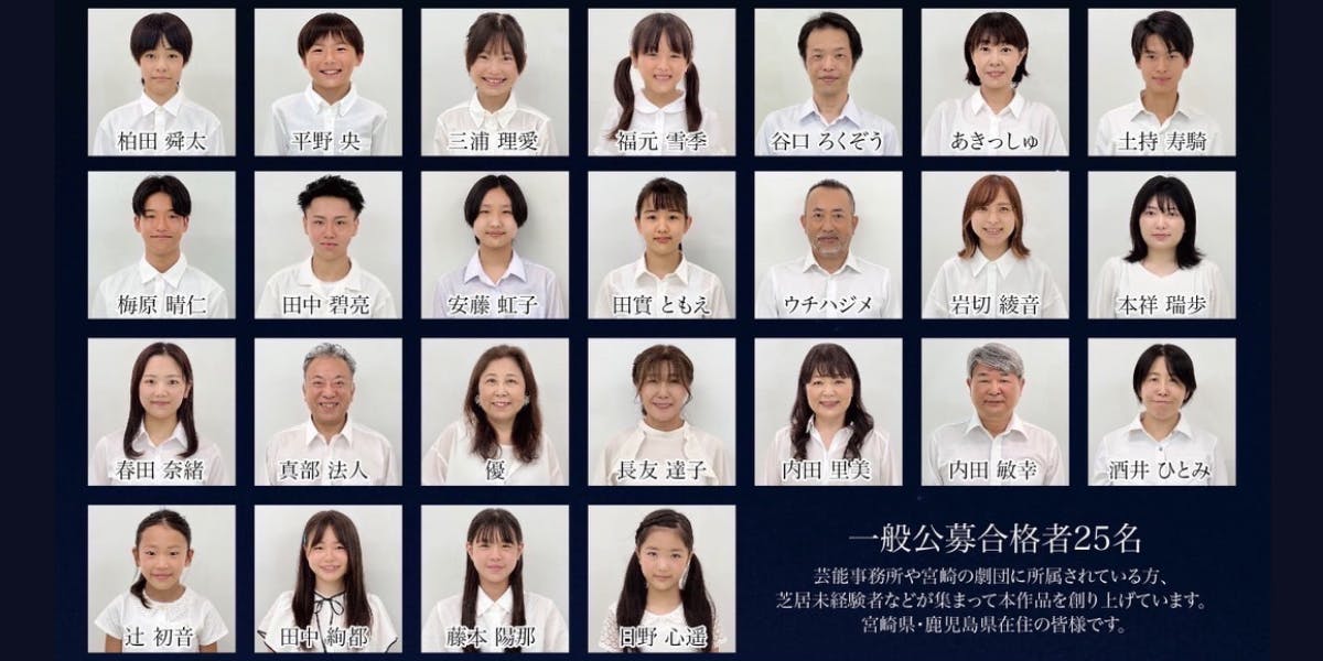 舞台「花火大会の夜」の主要キャストは東京で活躍するプロの俳優が務め、一般公募で合格した 25 名は地元宮崎県と鹿児島県在住の方々です。日常生活では味わえない体験がスキルを磨き、芝居未経験者がプロの役者と一つの作品を創り上げ、大勢の人の前で演じることで新たな自分と出会うきっかけを作ります。