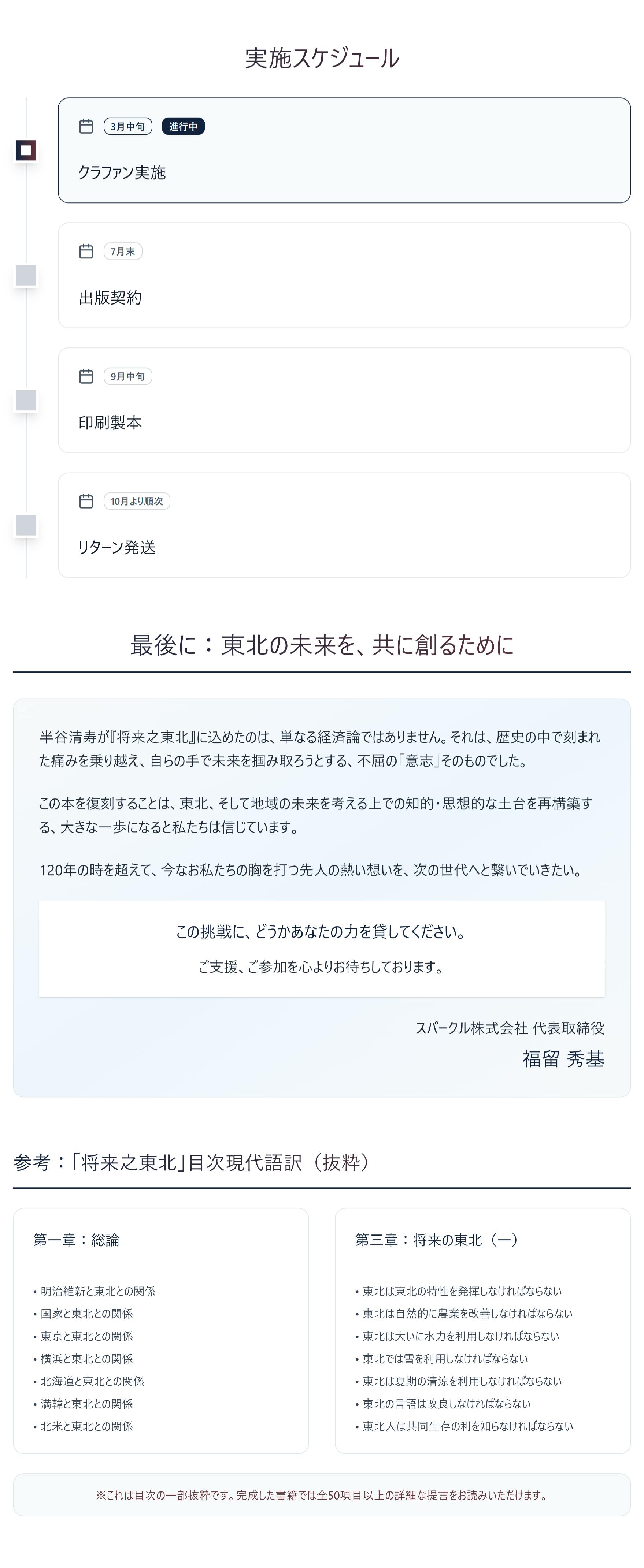 【書籍お届けコース】 ・完成した現代語訳版『将来之東北』(新書サイズ)を1冊お届け ・出版記念小冊子を1冊同封(冊子サイズ:B6、16ページを予定) ・福留よりお礼のメールと活動報告