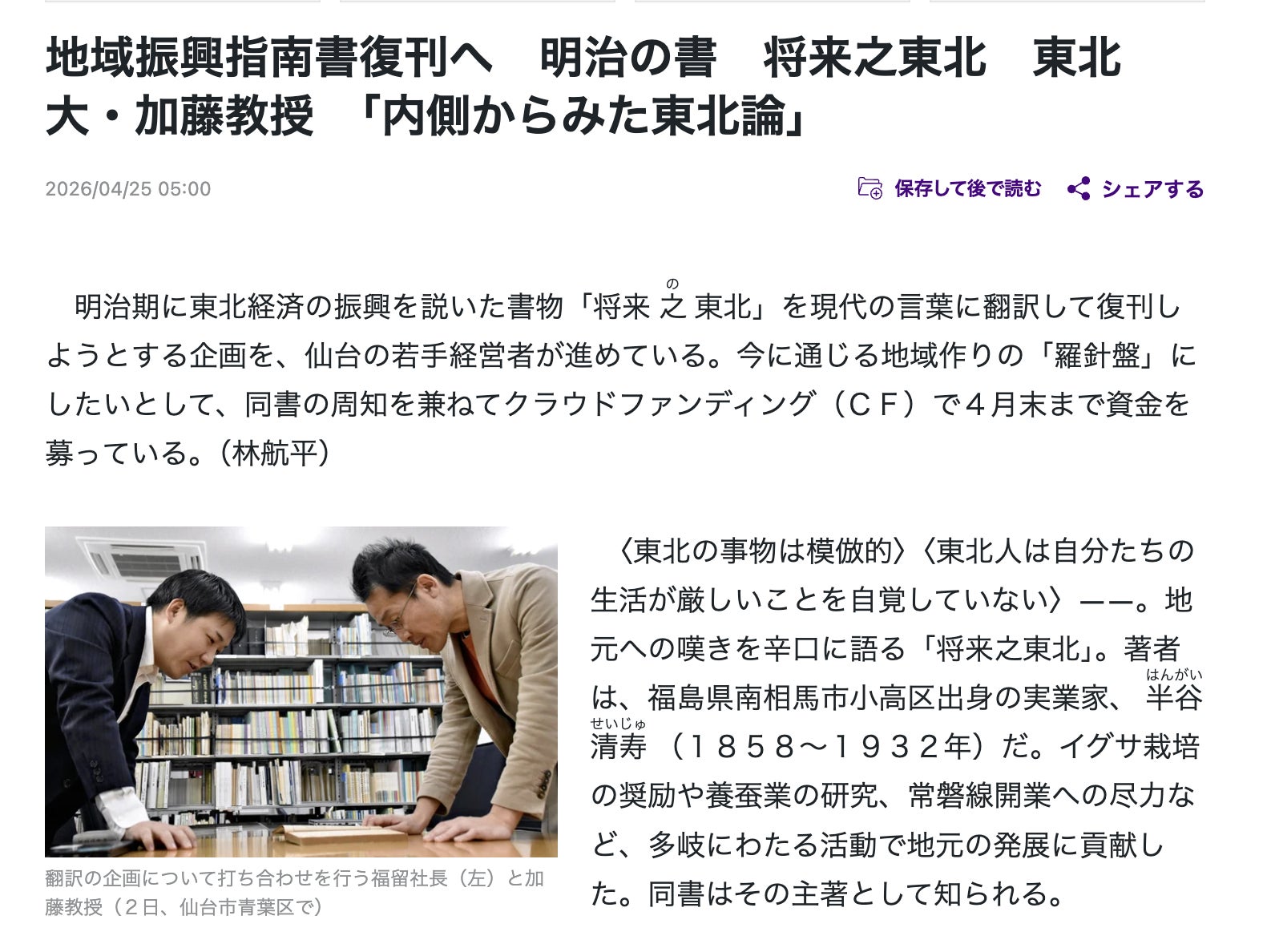 東北の起業家支援に心血を注ぐ彼が、今、100年前の名著の復刻に挑んでいます。