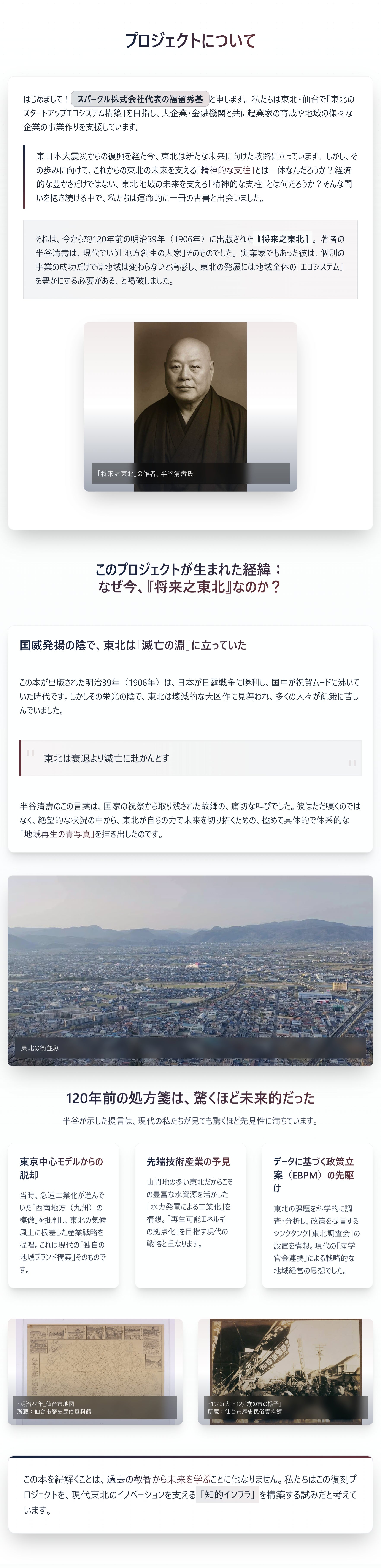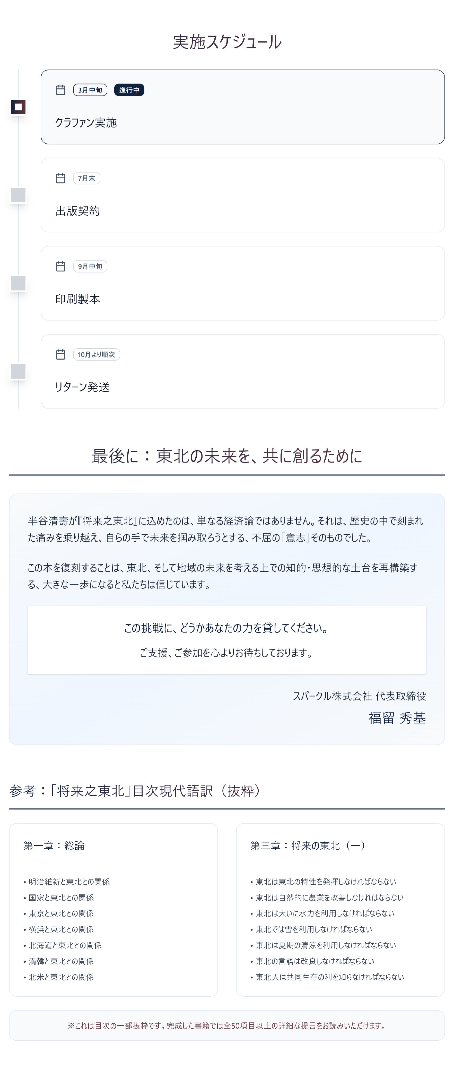 2026/04/22 18:00将来之東北クラウドファンディング残り8日!昨日も新しく支援いただいたみなさまありがとうございます!本日は、スパークル株式会社も支社を置く福島県南相馬市小高区より、「地域の100の課題から100のビジネスを創出する」をミッションに掲げ、起業家支援や地域づくりの事業を行っているOWB株式会社の和田 智行さんより応援コメントを頂きましたので紹介いたします。南相馬市小高区は「将来之東北」の著者、半谷 清壽氏の出生の地です。そんな地で震災後にパイオニアとして、事業開拓を行っておられる和田さんよりコメントいただき、心より感謝申し上げます。応援コメント株式会社OWB 代表取締役社長和田 智行 さん半谷 清壽氏は私が生まれ育った町であり、原発事故により避難指示区域となった小高区の偉人です。また彼が新興した織物業は和田家の稼業でもあり、産業を興し自立的な地域を目指せという提言はまさに弊社のビジョンでもあり、その提言が生まれた地で地元の自分が実践していることに誇りをもっています。そんな小高の精神を表現する書が、小高の住民でない福留さんの手によって翻訳されるのはちょっと悔しいですが(苦笑)、より多くの方が「将来之東北」を知っているという世界線にワクワクしております。応援してます!和田 智行さんプロフィール1977年福島県南相馬市生まれ、在住。2011年3月の原発事故により家族とともに約6年間の避難生活を余儀なくされる。2014年、居住が認められない避難指示区域にて創業し、食堂、仮設スーパー、ガラス工房、コワーキングスペース、宿泊施設など、一度は住民ゼロとなった町に30以上の事業を創出。2017年よりローカルベンチャー事業の誘致・支援を開始。福島の復興・創生期間終了後を見据えた自立的で持続可能なまちづくりに取り組む。株式会社OWB HP: https://owb.jp----------------------------------------------------------------------------------本プロジェクトのメディア掲載の紹介・4/17 NHK仙台「てれまさ」にて取り上げていただきました。https://news.web.nhk/newsweb/na/nb-6000035936・4/8 河北新報に誌面掲載いただきました。https://kahoku.news/articles/20260407khn000032.html・3/28 福島民報に誌面掲載いただきました。https://www.minpo.jp/articles/-/92745 もっと見る