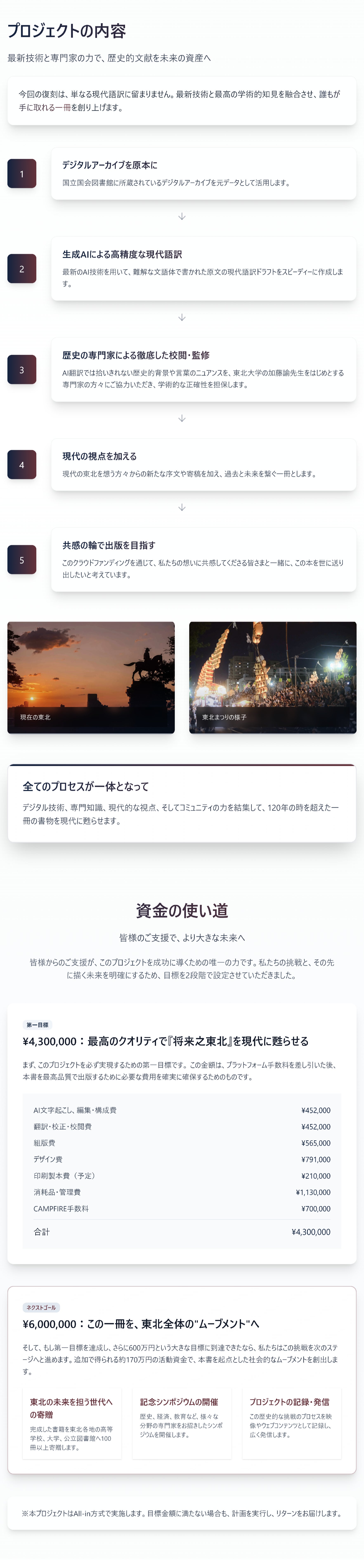 「将来之東北」クラウドファンディング終了まで残り1週間!ラストスパートです!最後まで応援よろしくお願いします!本日は、今回の再出版プロジェクトの中でも特に大きくサポートしていただいた株式会社スタジオユリグラフのお二人をご紹介いたします。今回の再出版においては明治時代に半谷清壽さんによって書かれた原文のニュアンスをなるべく多く汲み取りながら、現代に伝え活かす事ができるように初版の文章を翻訳からやり直しています。原文は下記の画像のように、そのままでは大変読みづらいのです。引用:https://dl.ndl.go.jp/pid/798585/1/1スタジオユリグラフさんには、原文を現代語訳していただくにあたり、スタジオユリグラフで持つ生成AIを活用したライティングアシスタントの機能を活用し、1次翻訳の作成と出版に関わる支援をいただいています。それでは、代表取締役社長の森石さんとプロジェクトをリードしていただいているディレクターの中村さんの応援コメントを紹介いたします。応援コメント株式会社スタジオユリグラフ 代表取締役社長森石 豊 さん今回、初版の翻訳に生成AIを使用するにあたり、扱うデータや制作フローにおいて著作権の問題がないかに最も気を配りました。また、生成AIを用いた翻訳には、内容の曲解や大幅な省略など、意図しない挙動がどうしても起こる可能性があります。細かな原文のニュアンスについては加藤先生のお力添えを頂きつつも、その前提となる一次翻訳文については、大きな欠損・誤読がないかを全文目視でチェックを行い、「完全なAI任せ」とならないよう留意しています。ぜひ、クラウドファンディングに応援いただき、実物に目を通して頂けると嬉しい限りです。応援よろしくお願いします。森石 豊さん プロフィール株式会社スタジオユリグラフ代表取締役社長。「声を形にし、届けることで価値を生む」という理念の元、AIを活用したメディア運用・制作DXの支援サービス「AI編集室」や、生成AIを活用したライディングアシスタント「Xaris」の提供・運営を行うディレクター中村 槙之介 さん福留さんにお声がけをし、このプロジェクトが走り出せたこと。想定以上にさまざまな東北の方を巻き込みプロジェクトが進んでいることに感動をしています。もっと多くの東北をルーツとする方にこれからの東北を考えるこの一冊を届けたいと思っています。是非、応援をよろしくお願いします! 中村 槙之介さん プロフィール プロデューサー/ディレクター。フリーとしてさまざまなクリエイティブ制作やIT SaaSのセールス組織の立ち上げなどに従事し、何かの「はじまり」に顔を出し立ち上げや事業開発などの動きをしております。株式会社スタジオユリグラフについてわたしたちは「美しい言葉を、世界に贈ろう」というビジョンのもと、生成AIをはじめとするテクノロジーを活用した、新たな言葉の価値や表現を追求する編集・制作スタジオです。自社開発のAIライティングアシスタント「Xaris」を起点とし、AIによる効率化を追い求めるだけでなく、AIと人の共創によって、新たな言葉の価値を生み出す支援を行っています。ウェブサイト:https://studioeurygraph.com/AIライティングアシスタントXaris(カリス):https://site.xaris.ai/森石さん、中村さん応援コメントありがとうございました!引き続き、出版までよろしくお願いいたします!----------------------------------------------------------------------------------本プロジェクトのメディア掲載の紹介・4/17 NHK仙台「てれまさ」にて取り上げていただきました。https://news.web.nhk/newsweb/na/nb-6000035936・4/8 河北新報に誌面掲載いただきました。https://kahoku.news/articles/20260407khn000032.html・3/28 福島民報に誌面掲載いただきました。https://www.minpo.jp/articles/-/92745 もっと見る