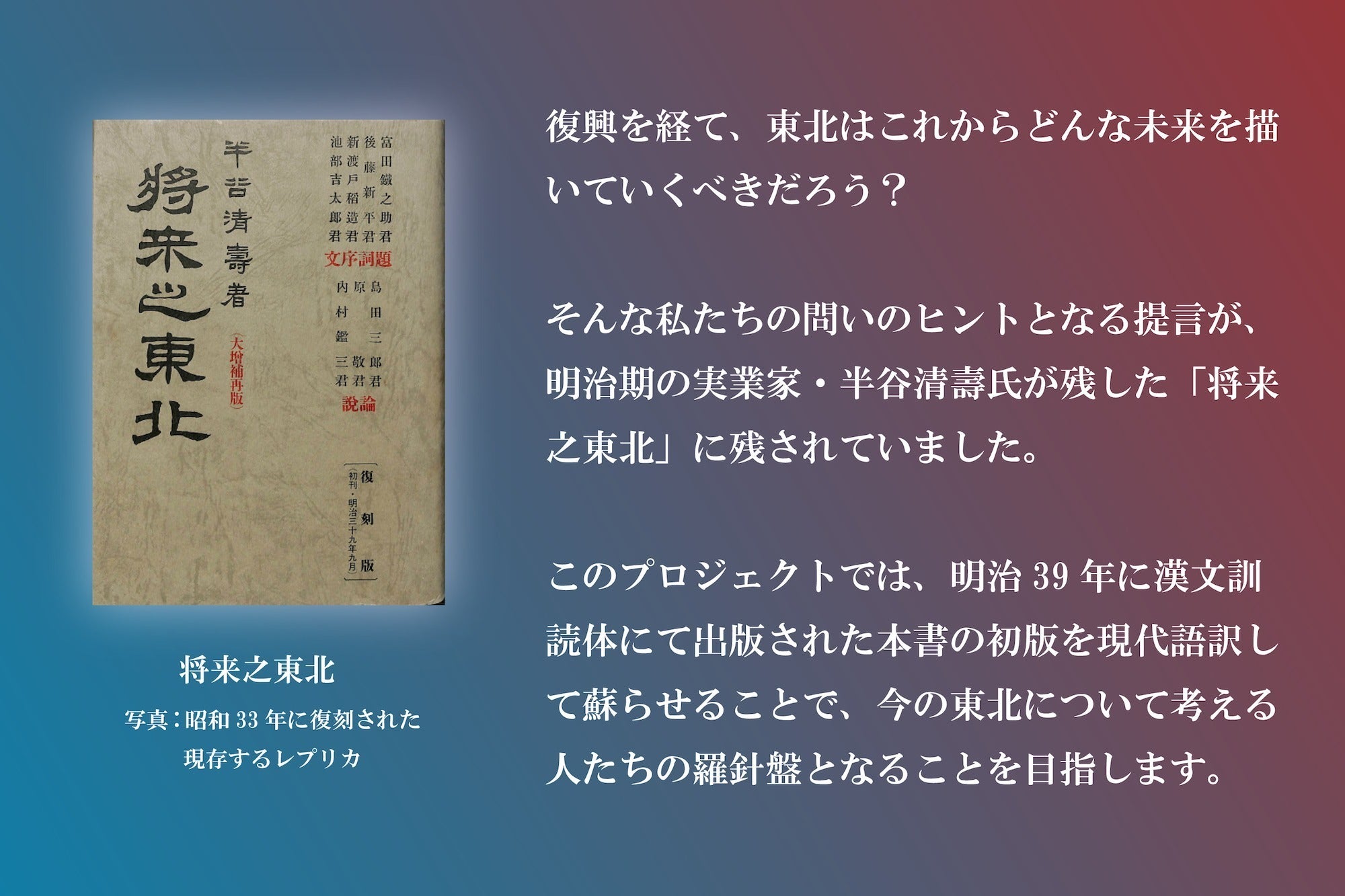 2026/04/24 18:00「将来之東北」再出版プロジェクトのクラウドファンディングを立ち上げた初日、スタッフに1件の連絡が入りました。それは知り合いの学生が高校時代に探求活動で「将来之東北」について取り上げていたとのことでした。さっそく連絡先を繋いでいただき、後日スタッフより探求活動や「将来之東北」を読んでの未来への必要性などお伺いさせていただきました。今日はその内容についてご紹介させていただきます。なぜ高校の探求で「将来之東北」を取り上げようと思ったのか?スタッフ: 本日はお忙しい中ありがとうございます。吉田さんが中学から高校まで「将来之東北」をテーマに探究活動を進めてこられた経緯を教えていただけますか?吉田はるか: こちらこそありがとうございます。吉田はるかと申します。経緯ですが福島県ふたば未来学園の中学から高校までの探究活動で、中学1年生の時に富岡町にある夜の森の桜並木について調べた後、次のテーマに悩んでいた時に、1年生の時の資料から半谷清壽さんの名前を再び見つけたのがきっかけでした。半谷清壽さんに関する資料が少ない中で、先生に助言をいただき本を読み始めたのですが、特に「東北人は偉大な人の文献を残さず」という言葉に、当時の状況と資料が見つからない自分の状況が重なって、共感と知的好奇心が湧き、探究を深めることになりました。スタッフ: とても素晴らしい好奇心と探求ですね。「将来之東北」を読んで、吉田さんが最も強く印象に残ったメッセージはどのようなところでしたか?吉田さん: 最も印象に残ったのは「東北は戊辰戦争の負け組」という言葉です。過去の歴史を見ても、東北が多くの戦いで負け続けてきたという認識が自分自身に強く響き、このメッセージを伝えたいと考えて発表資料を作成しました。発表資料では、原文を現代語訳するよりも、図や絵を用いて「誰が見ても分かりやすいように」することに注力しました。吉田さん作成「将来の東北 分かりやすい版」よりスタッフ: その強いメッセージを、現代を生きる世代に伝わりやすい形にされたのですね。探究活動を続ける中で、半谷さんの想いについてどのように考察されましたか。吉田さん: 半谷さんは言っていることは少しめちゃくちゃだなぁと感じるところもありつつ、その時代背景として、磐梯山の噴火、三陸の津波、飢饉といった災害をなくしたいという切実な思いにあったのではないかと考察しました。また災害による被害を減らすことで東北はきっと良くなる、という半谷さんの想いを、発表の結論部分にまとめました。スタッフ: その考察は、震災から15年が経過した今、私たちが次の未来を見据えて行動していくための「価値ある基盤」として、この本を再出版しようとする私たちの考えとも深く通じていますね。学生から見る「将来之東北」を現代に再出版する意義とはスタッフ:探究活動を通して、吉田さんの価値観はどのように変化しましたか?吉田さん: 学校で学ぶ歴史を単に「丸暗記」するのではなく、「なぜその状況になったか」という過程までを「理解」することの重要性を痛感しました。また、福島県内であっても浜通りとそれ以外の地域では、震災や原発に関する知識量に圧倒的な差があることに気づき、日本全体で満遍なく知っておくべきだという考えを持つようになりました。吉田さん作成「将来の東北 分かりやすい版」よりスタッフ: 最後に、この「将来之東北」という本が現代においてどう重要になると思いますか?吉田さん: この本は、日本人全体が「自分で物事を考える」力を養うための一つの手段となり得ると思っています。そして、「何かヒントが欲しい」と考える東北に関係する人々にとって、次に進むための「手段の一つ」として、この本が記憶されることを願っています。スタッフ:吉田さんありがとうございました!吉田さん: こちらこそありがとうございました!クラウドファンディングの成功、応援しています!----------------------------------------------------------------------------------本プロジェクトのメディア掲載の紹介・4/17 NHK仙台「てれまさ」にて取り上げていただきました。https://news.web.nhk/newsweb/na/nb-6000035936・4/8 河北新報に誌面掲載いただきました。https://kahoku.news/articles/20260407khn000032.html・3/28 福島民報に誌面掲載いただきました。https://www.minpo.jp/articles/-/92745 もっと見る