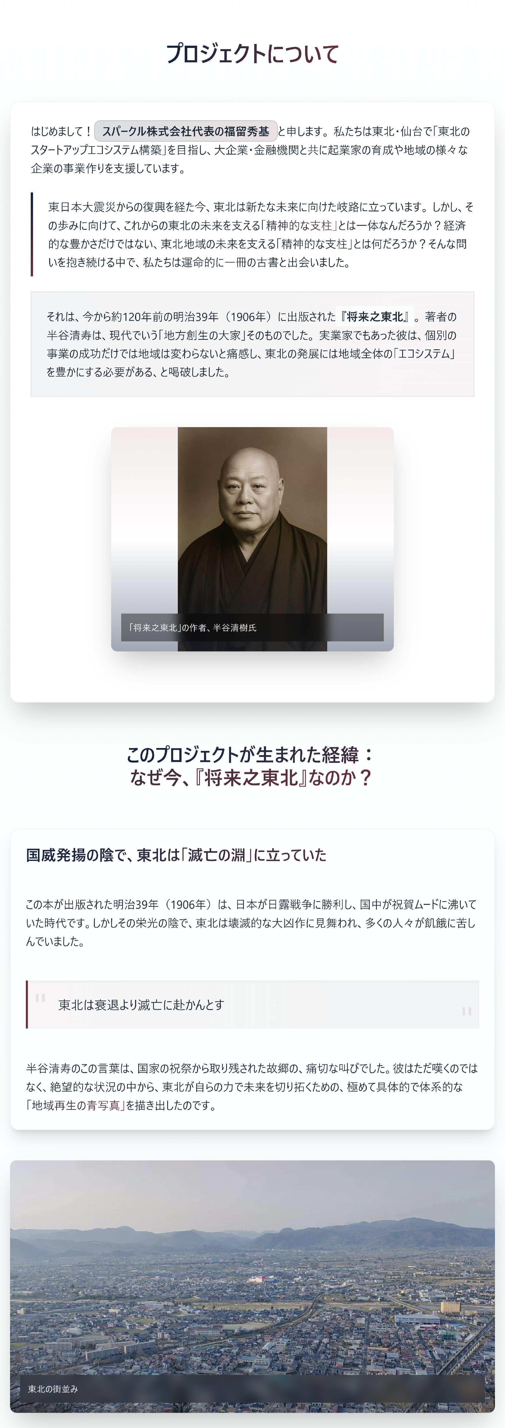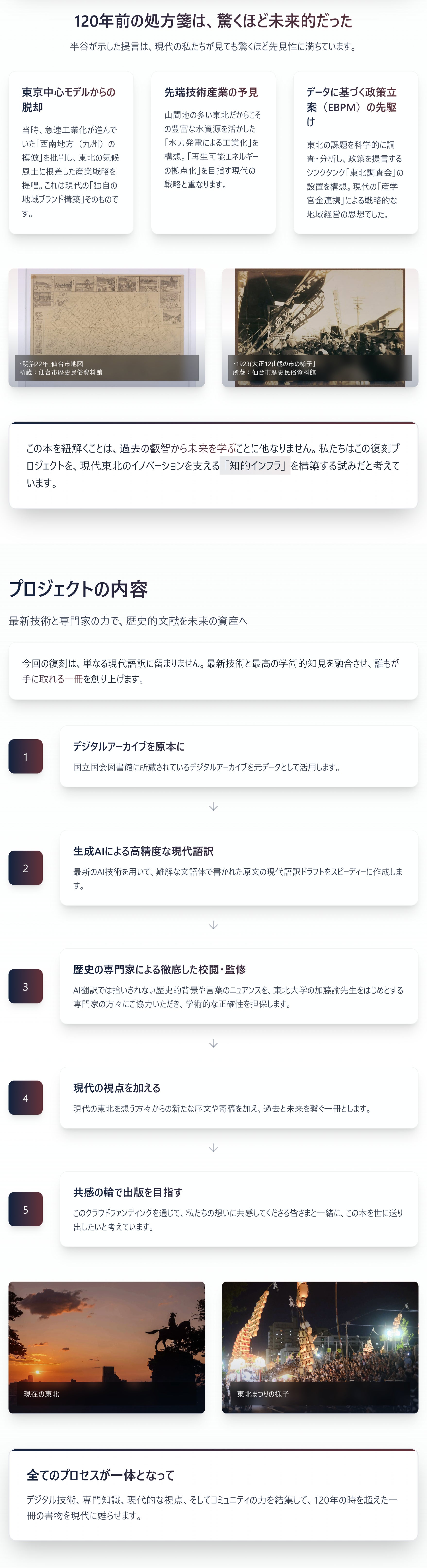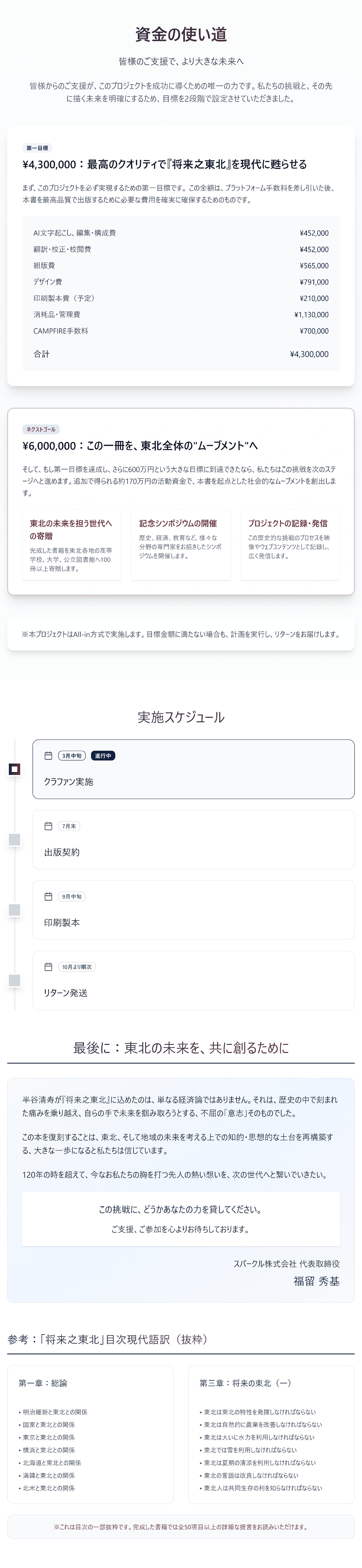 2026/04/11 12:00応援ありがとうございます!4月10日(金)現在、応援していただいた方が136名、目標比35%となりました。前回の活動報告を掲載してから、かなり多くのページアクセスと応援をいただいております。本当にみなさまありがとうございます!引き続き応援よろしくお願いします!前回の活動報告はこちらから→https://camp-fire.jp/projects/889577/view/activities/828366#main河北新報さんにご紹介いただきました!4月8日の誌面で、「将来之東北」再出版プロジェクトについてご紹介いただきました。しっかりと取材いただき、丁寧に文章も作っていただきました。さらに、1面でも掲載の紹介をいただき、感動しました。河北新報様本当にありがとうございます。記事はオンラインからも読むことができます。ぜひお読みください。(※無料会員登録が必要になります。ご了承ください。)https://kahoku.news/articles/20260407khn000032.html今年も東北の挑戦者が集うカンファレンス「ATERUI2026」、2026年9月3日(木)〜4日(金)に仙台で開催決定!昨年、9月に初めて開催したビジネスカンファレンス「ATERUI」は事前の想像を超える500名以上の参加者で、大盛況となりました。この再出版プロジェクトを初めてリリースしたのも昨年「ATERUI」の閉会式でした。その熱狂を今年はさらに進化させ、東北の後継ぎ・起業家で「共同戦線」を張ることをテーマに業種や立場、そして無関心の壁をも越えて、互いの強みが挑戦を助け、応援が情熱を後押しする、温かく強固なコミュニティの輪を広げることを目指します。今年はこの再出版する「将来之東北」を皆さん持ち寄っていただき、一緒に東北の将来について語らうことができれば、何より嬉しいです!こちらプレスリリースを本日出しましたので、ぜひご覧ください!https://prtimes.jp/main/html/rd/p/000000085.000107076.html もっと見る