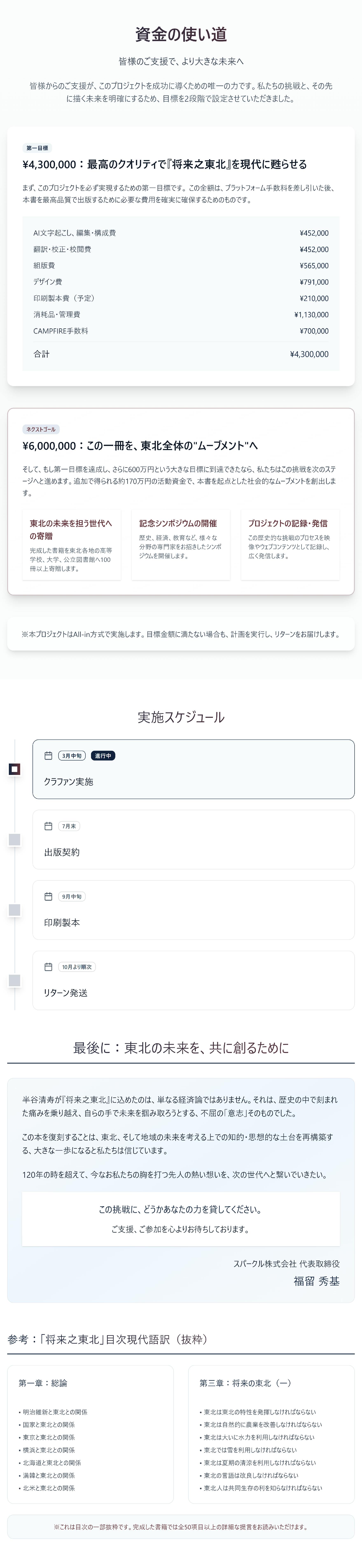 【サイン付き書籍お届けコース】 ・福留のサイン付き現代語訳版『将来之東北』(新書サイズ)を1冊お届け ・出版記念小冊子を1冊同封(冊子サイズ:B6、16ページを予定) ・福留よりお礼のメールと活動報告