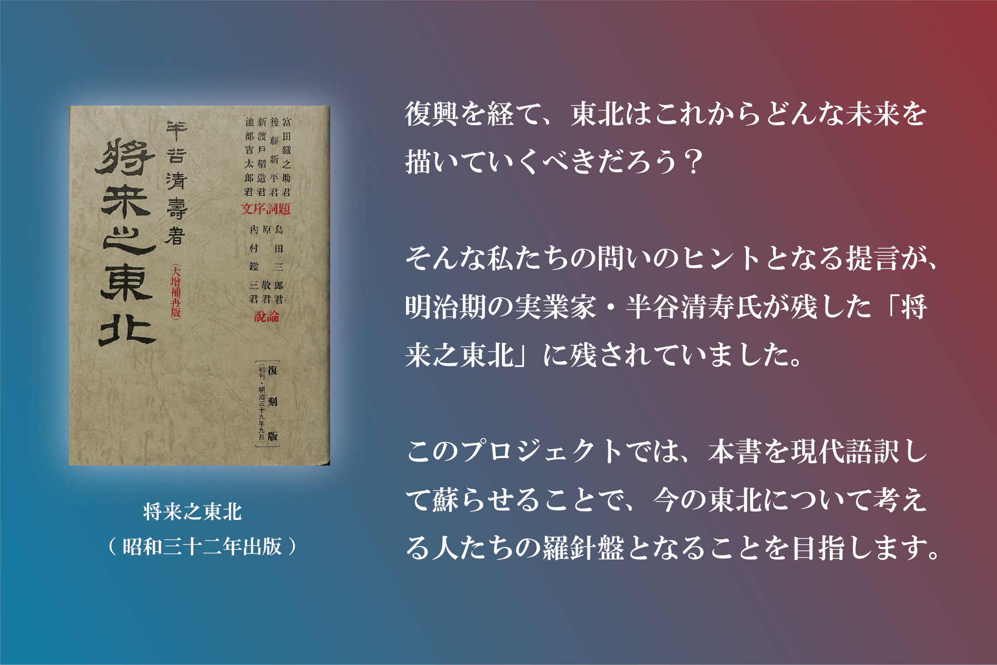 【この本を読んでほしい方にプレゼントコース】 ・完成した現代語訳版『将来之東北』(新書サイズ)をあなたのご友人にお届け ※注意事項:プレゼントを送る方へ事前に了承いただいた上で、支援いただきますようお願いいたします。 ※支援時に備考欄にプレゼントを送る方のご住所、お名前を必ず本人にご確認の上、ご入力ください。 ・出版記念小冊子を1冊同封(冊子サイズ:B6、16ページを予定) ・福留よりお礼のメールと活動報告