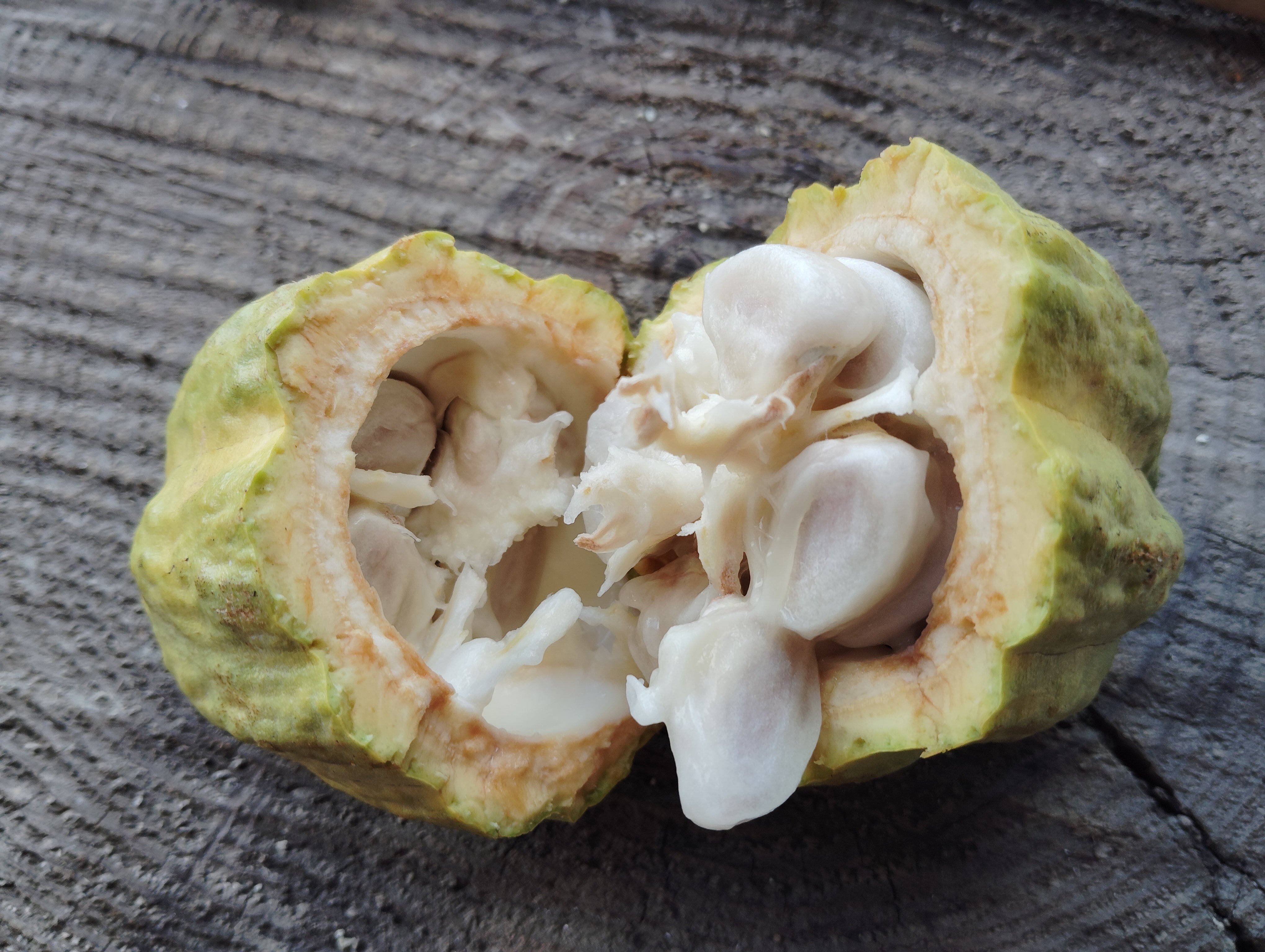 カカオ果実はかぼちゃのように数センチの固い皮に覆われています。これをかちわると、中身が出てきます。