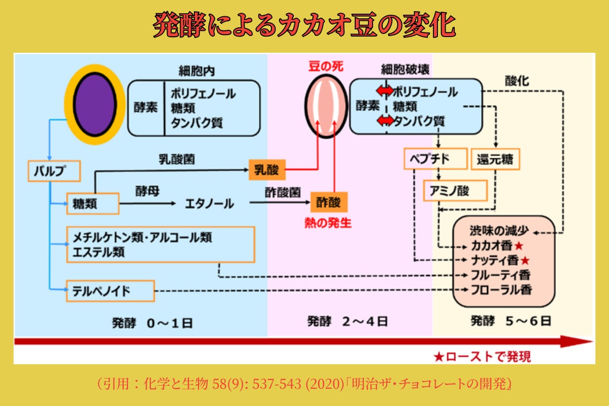 この過程で果肉から種へ香りの成分が移ろったり、化学反応によってチョコレートらしい香りの元となる物質が生成されます。