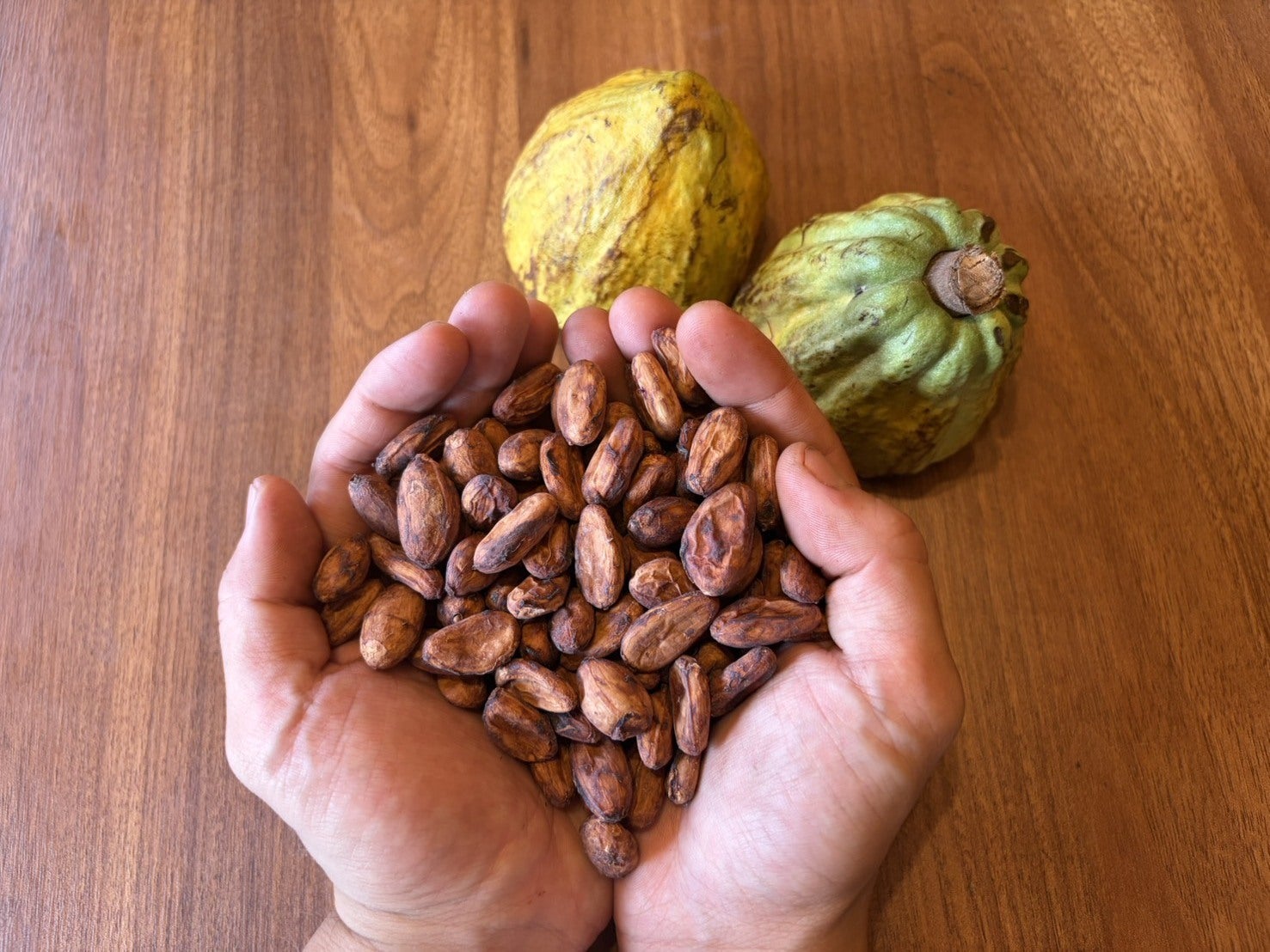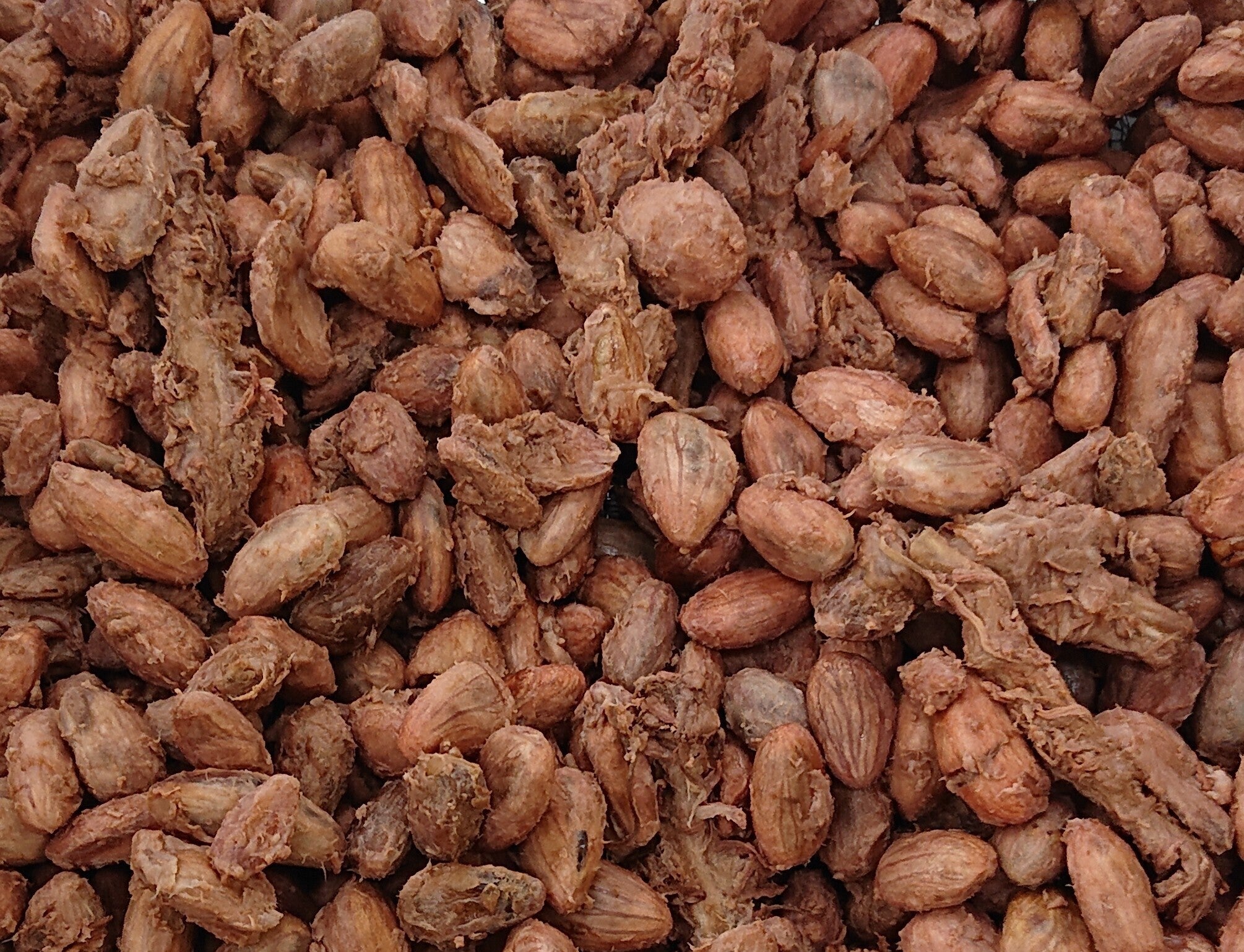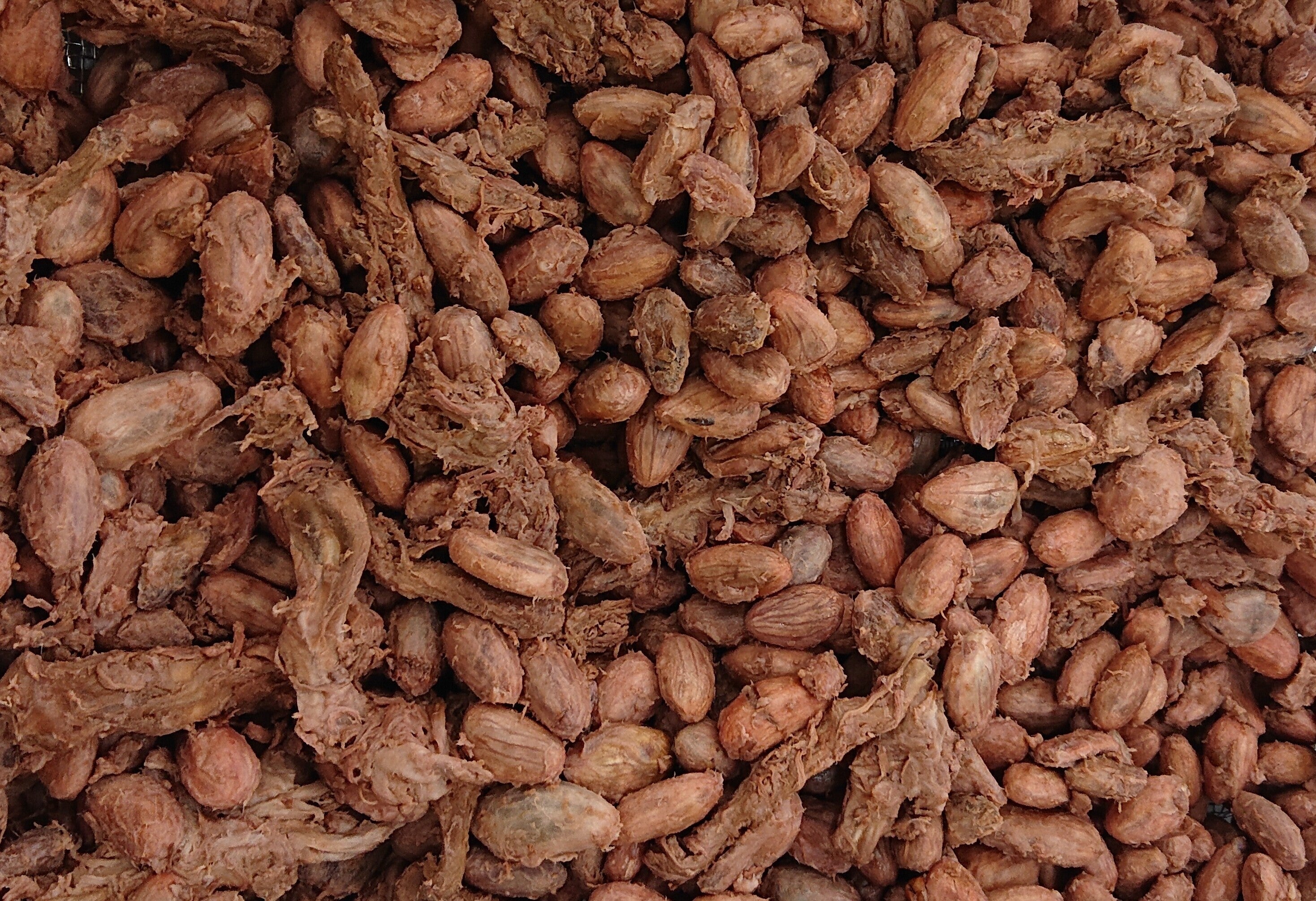 じっくりと乾燥させて水分を抜いていくと、ようやくチョコレート原料となる「カカオ豆」が出来上がります。