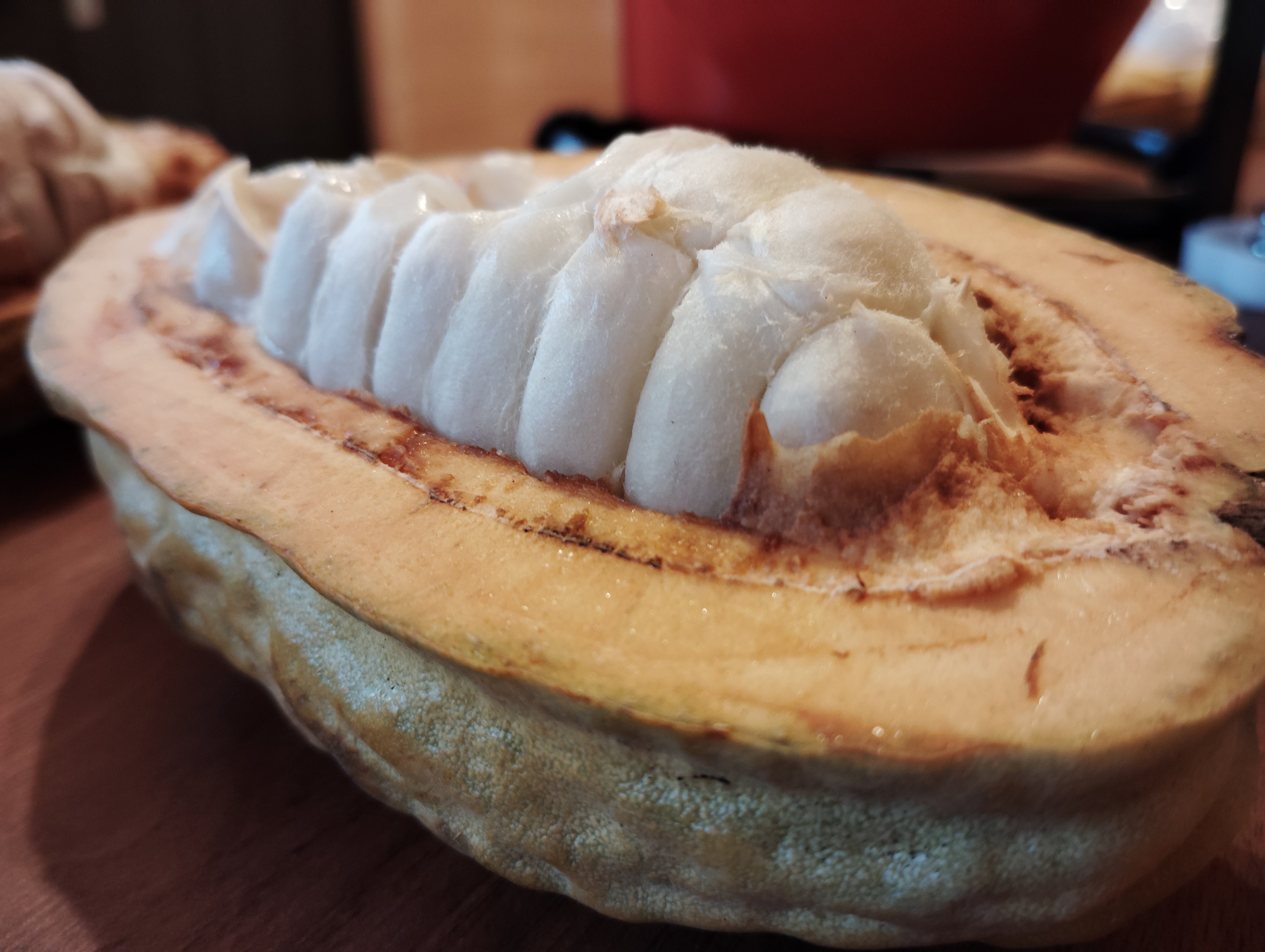 トップ画像がそのカカオを割った時の写真なのですが、白くプリプリとしたカカオ果肉(カカオパルプ)がしっかりと乗ったカカオを収穫することができました。