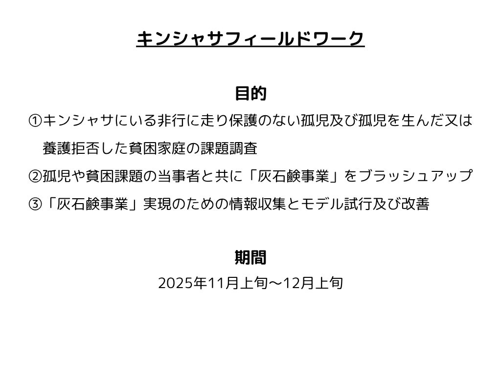 ・コンゴでのさらなる活動進展(例:灰を集めた孤児へのさらなる継続的な対価支払い・石鹸制作者へのさらなる継続的給料支払い・次回渡航費・現地職員雇用費など)