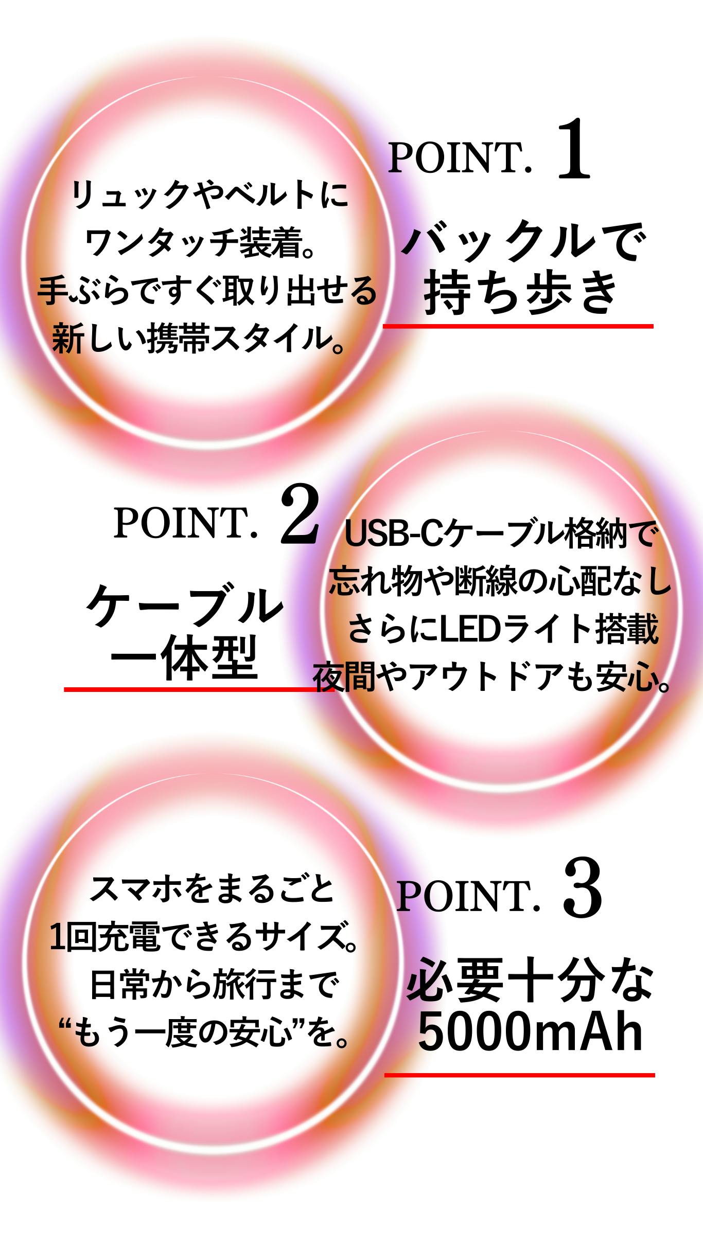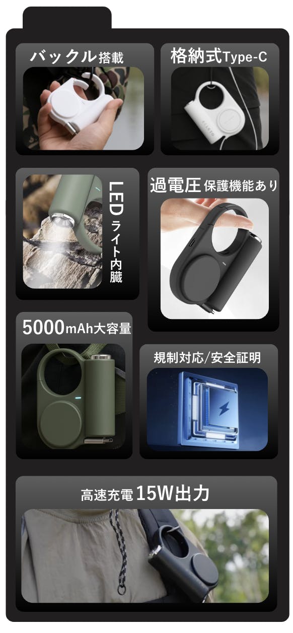 このモバイル充電器は、わずか200gの軽量設計で、どこへでもストレスなく持ち運べます。バッグやベルトにワンタッチで装着できるバックル付きなので、アウトドアや出張でもスマートに携帯可能。