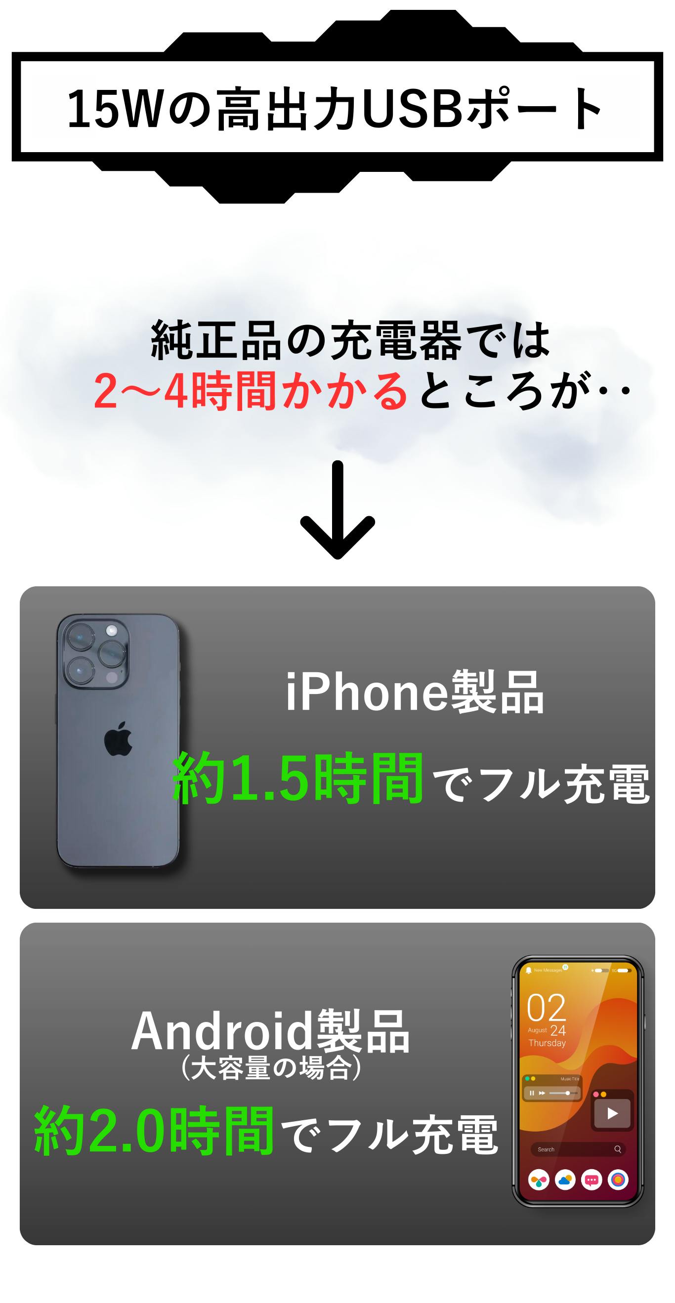 しかも5,000mAhの大容量バッテリーを搭載し、スマートフォンを約1〜2回フル充電できます。