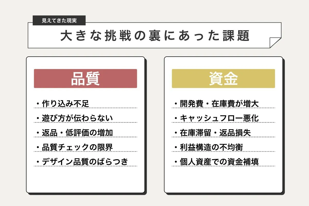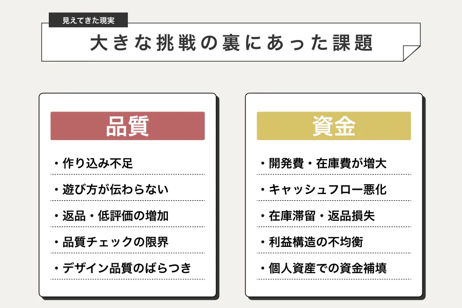 既存の商品が生み出す黒字だけでは数多くのゲームたちのデザイン費用、オンラインショップの制作費用、在庫発注費用を賄うことができませんでした。私自身も個人の所有物を売却して会社に全額出資をしたりすることもありました。