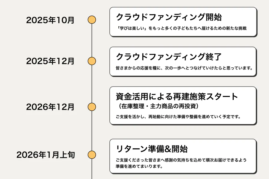 支援者の皆さまに安心して応援いただけるよう、活動の流れを以下のスケジュールで進めてまいります。プロジェクトの進捗は随時、活動レポートやSNSでもご報告いたします。