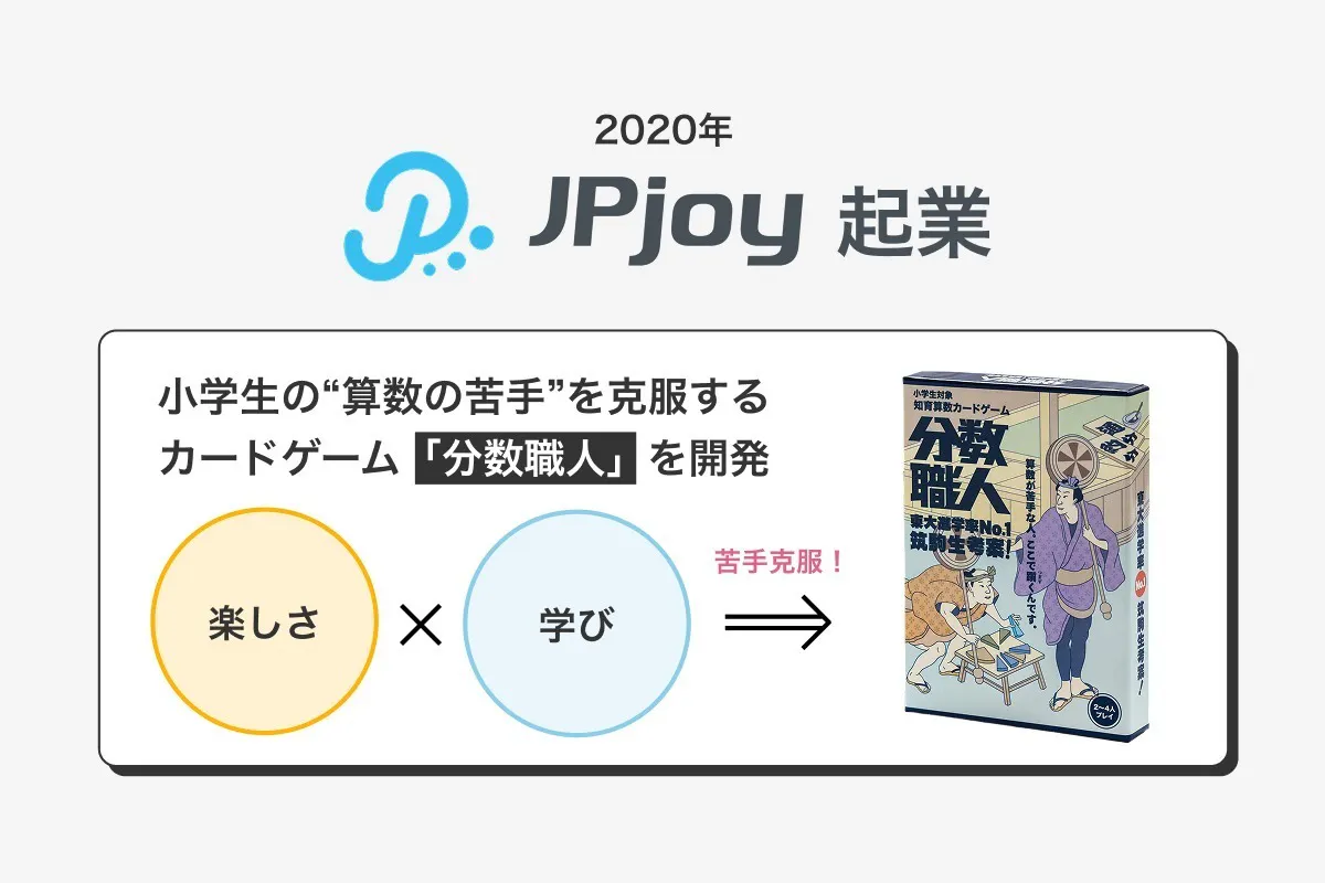 日本(Japan)から楽しい(joy)を広げていこうという思いで名付けたJPjoyでは、一番最初の商品として算数を楽しく学ぶことができる「分数職人」というカードゲームを出しました。