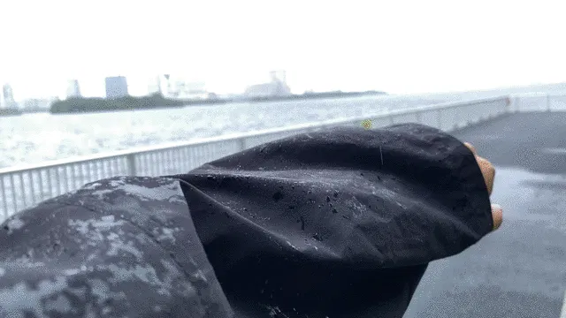 実際にこの同じ素材を使用した開発中のコートを着て体感して実験したところ、傘を差さずとも雨風の侵入を防いでいました。