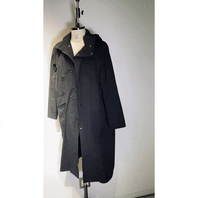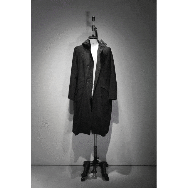 トウモロコシ由来のBotanicaltech®で軽量且つ強靭なRipstopを作って、更に全天候型の透湿防水シート膜を導入し「AEROTECT」を開発しました。その後コートにした時の重さ、裏側の色がファティーグパンツは白濁色でしたので、パンツでは良かったしっかり感をコート用に黒に軽量&改良しました。