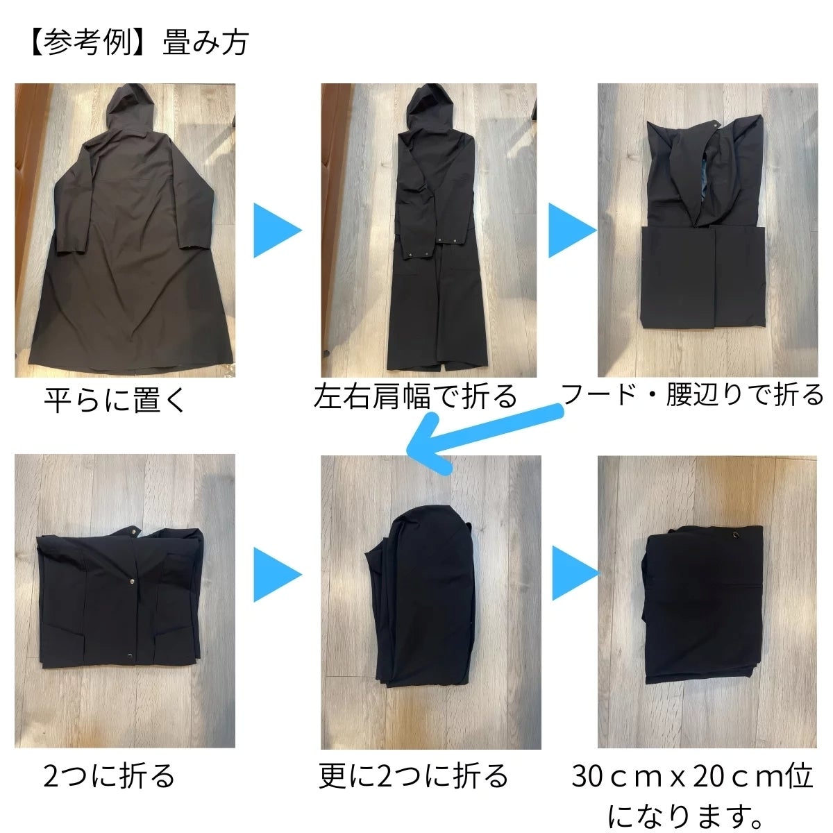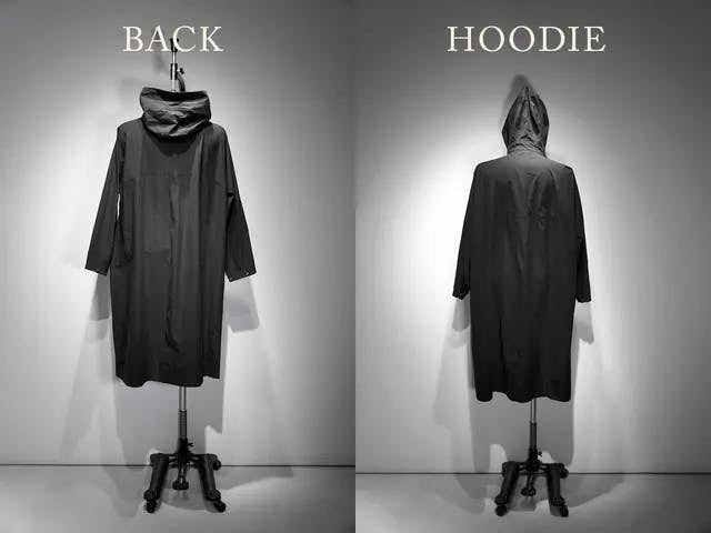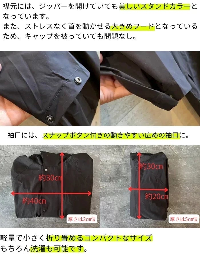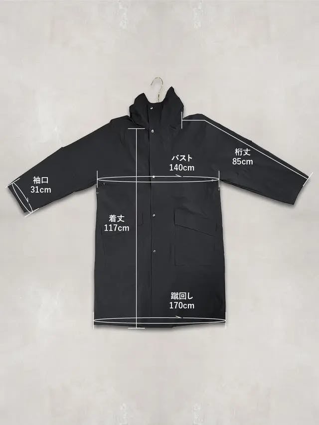 尚、大型の台風が近づく日にコートを着て体感して実験したところ、傘を差さずとも雨風の侵入を防いでいました。