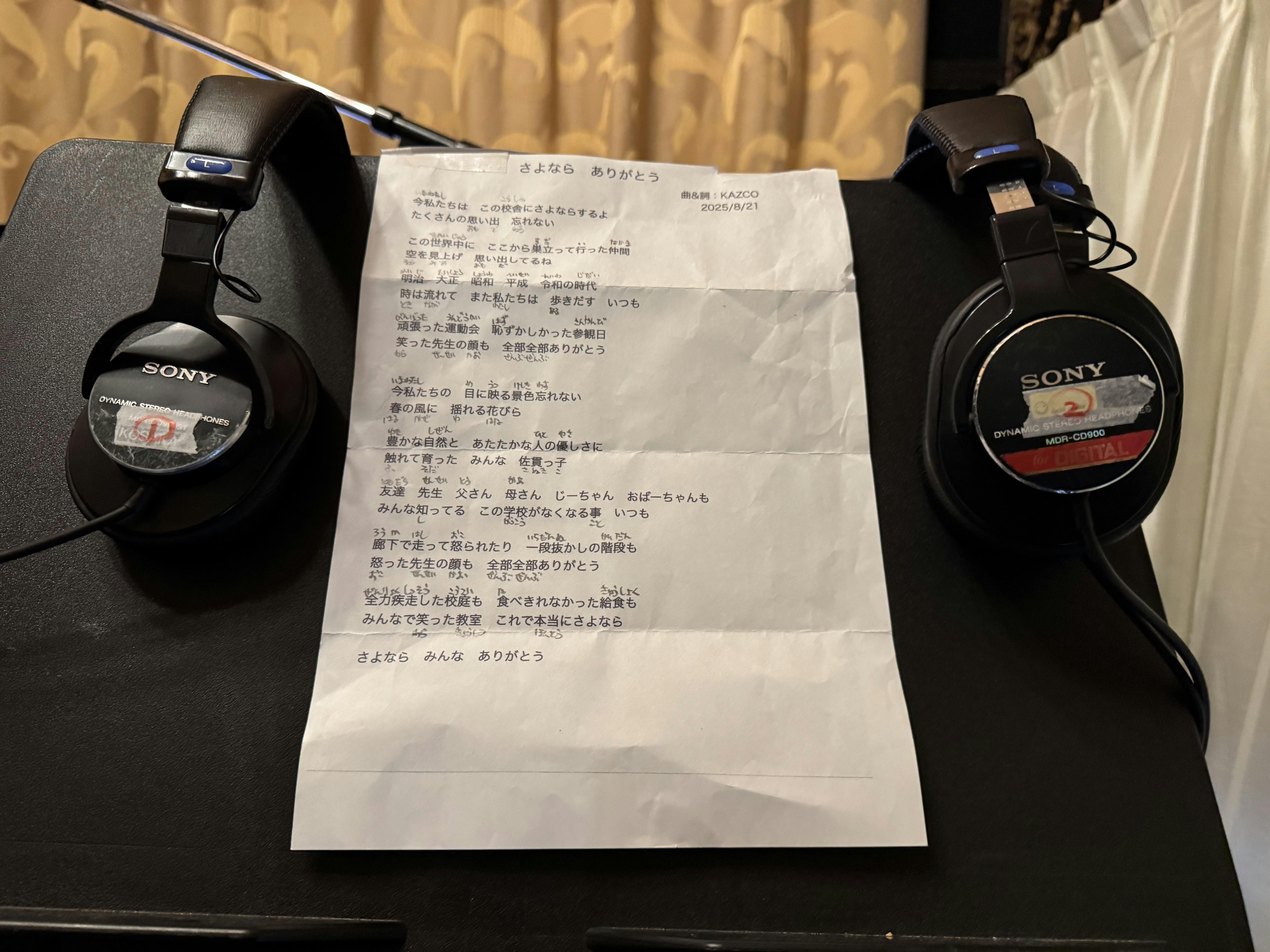 2026/02/01 10:48富津市立 佐貫小学校 閉校記念ソング『さようなら ありがとう』 作詞作曲:KAZCOレコーディングが開始しました。2026年1月31日、在校生の子供たちの有志によって、レコーディングが始まりました。送迎の保護者の皆さん、ご協力頂いております、実行委員会の皆さん、本当に感謝です。この活動は、実行委員会とは、直接関係のない、KAZCOのアイディアで始まったプロジェクトですので、地元の方々のご協力をいただけるなんて、思っておらず、ひたすら、感謝なのです。学校側のご協力で、募集のチラシも配布して頂いております。まずは、第一弾のレコーディングが終了。今回は、1、2、3年生の男の子達。KAZCOスタジオに入って来て、初めて見るレコーディング機材に、興味津々な子供達の目、笑顔、天使の歌声、完成を想像すると、涙を堪えるのが大変です。子供達もよく練習してくれていたのがわかり、グッと来るものがあります。歌詞カードには、ひらがながふってあり、ご自宅での親子のやりとりを想像し、愛情を感じました。現時点で、半数近くの在校生の方々が参加表明して下さってます。嬉しいです。恥ずかしがり屋さんや、受験を控えたお子さんもいらっしゃいますので、全員参加、とはいかないのは解っておりますが、想像よりも、既に上回っております。レコーディング期間は2月8日をタイムリミットとしております。最後の最後まで、予約を受け付けて、多くの気持ちを記録したいなと考えております。ご支援いただいた皆さんのお陰で、今日も、第二弾のレコーディングが間も無く始まります。また、報告投稿させていただきます。完成まで、どうぞ見守ってください。ありがとうございます。KAZCO もっと見る