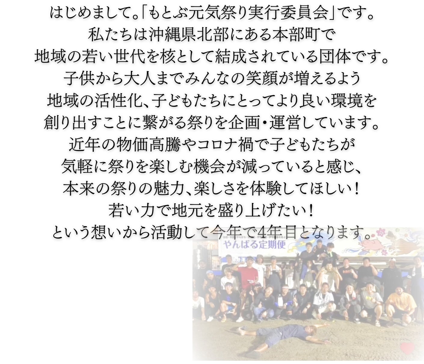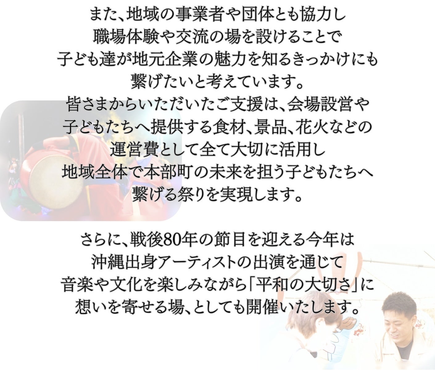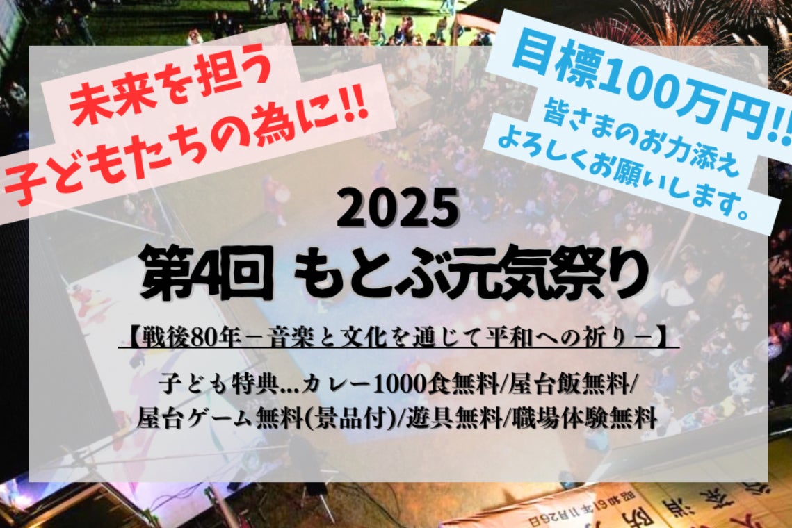 2025 沖縄県 本部町 もとぶ 子ども祭り 子ども食堂 祭り 地域活性化 キッズ ベビー もとぶ元気祭り 無料 イベント クラウドファンディング クラファン 戦後80年 平和 祈り ボランティア フェス 笑顔 未来を担う子どもたちのために 職業体験 エイサー 花火
