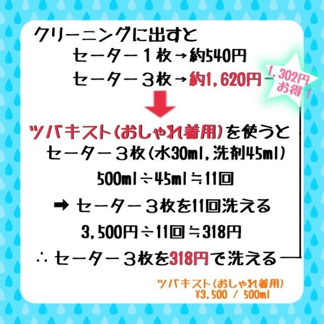 ※ ツバキスト500ml(3,500円)を使用し、水30mlとツバキスト(おしゃれ着洗い)45mlで洗濯した場合。