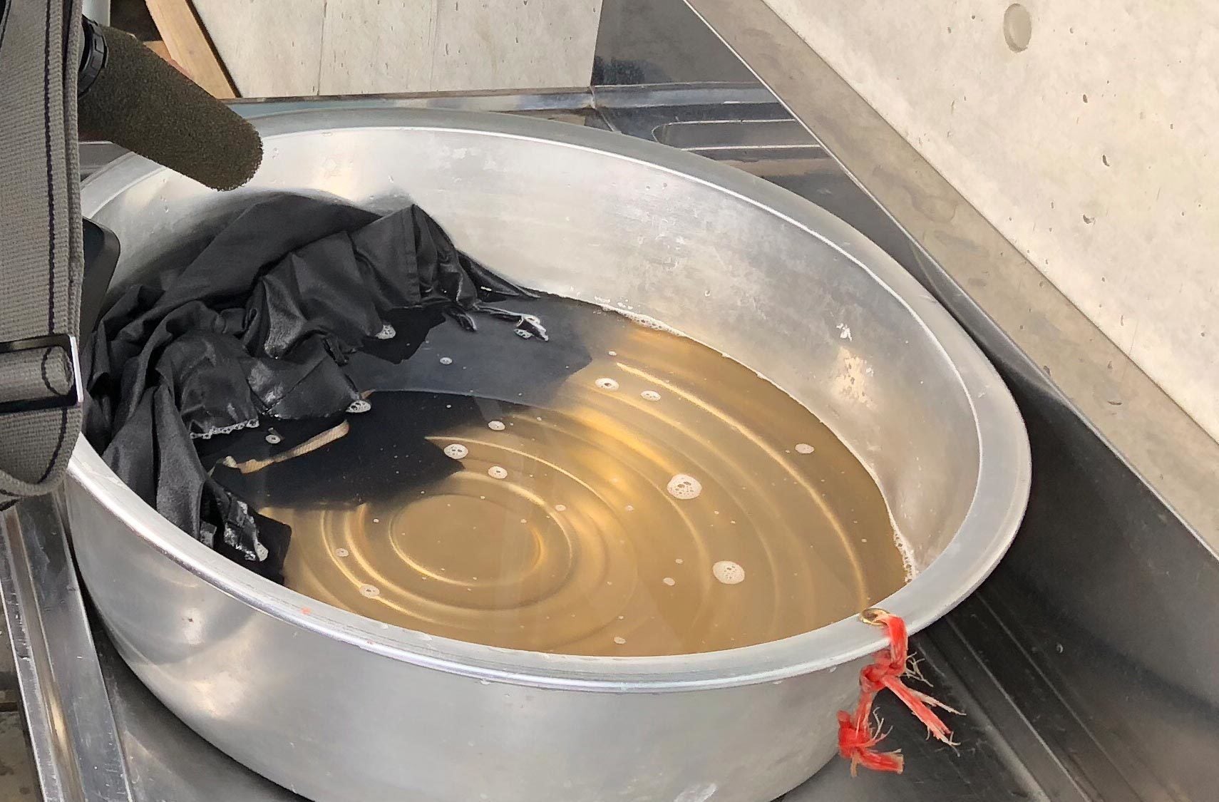 ドライクリーニング済みのスラックスをオリジナル洗剤が入った桶につけると…