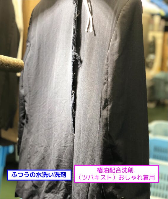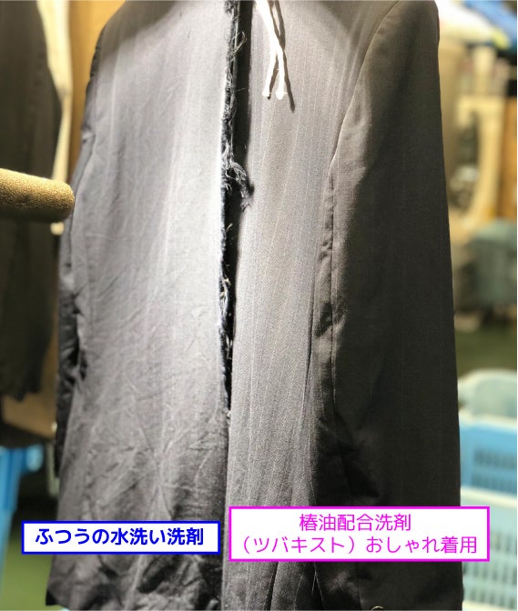 ※写真は、半分に切ったスーツを左右別々の洗剤で洗っています。