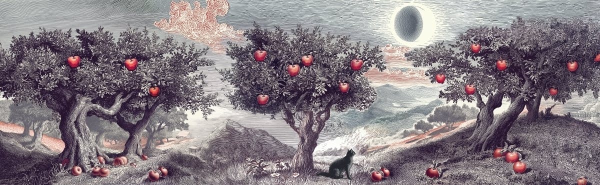 SHINSU SHE SAIDは、山麓に広がるりんご畑の情景を捉えています。ある秋の日、りんご狩りの最中に見かけた、北アルプスを背に自由に歩き回る猫たち。その印象的な光景が、デザインの着想となりました。よく目を凝らすと、ギリシャ神話にちなんだ黄金のりんごなど、遊び心あるディテールが随所に散りばめられています。